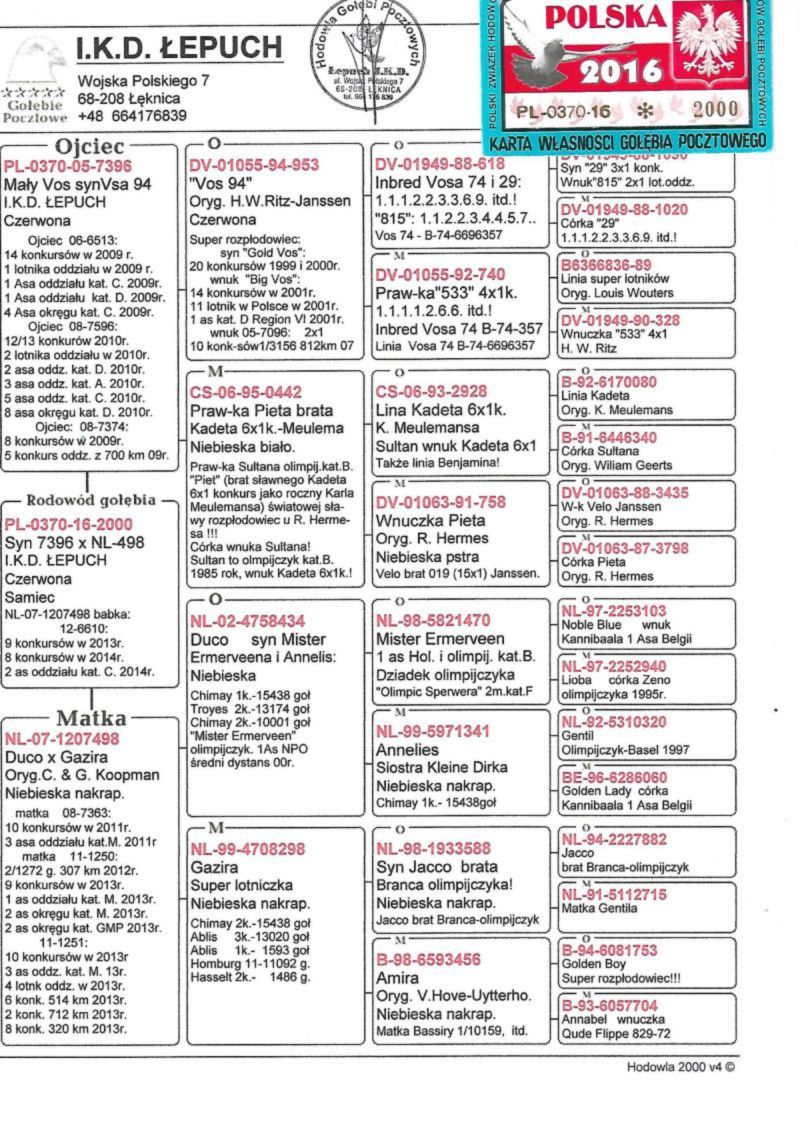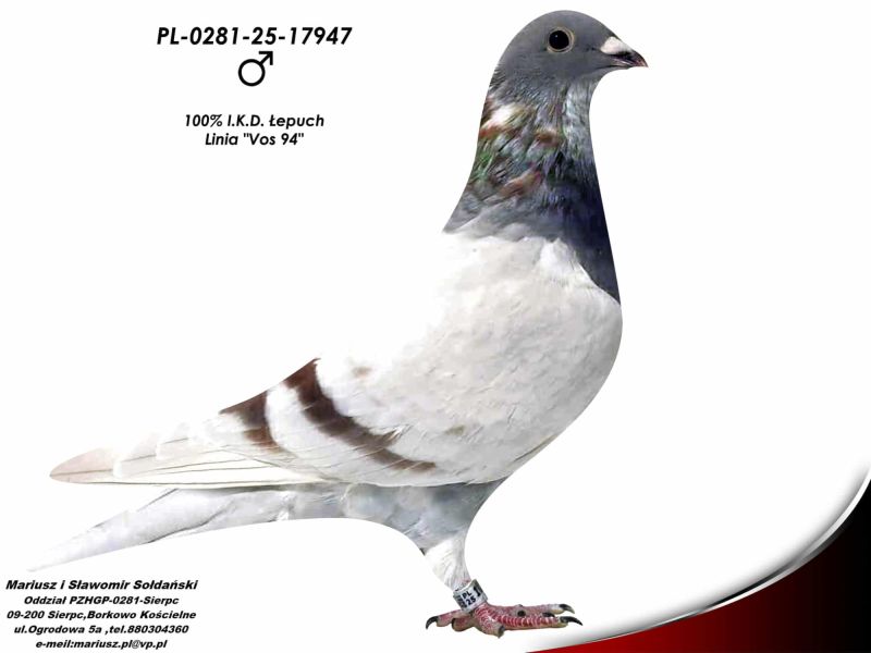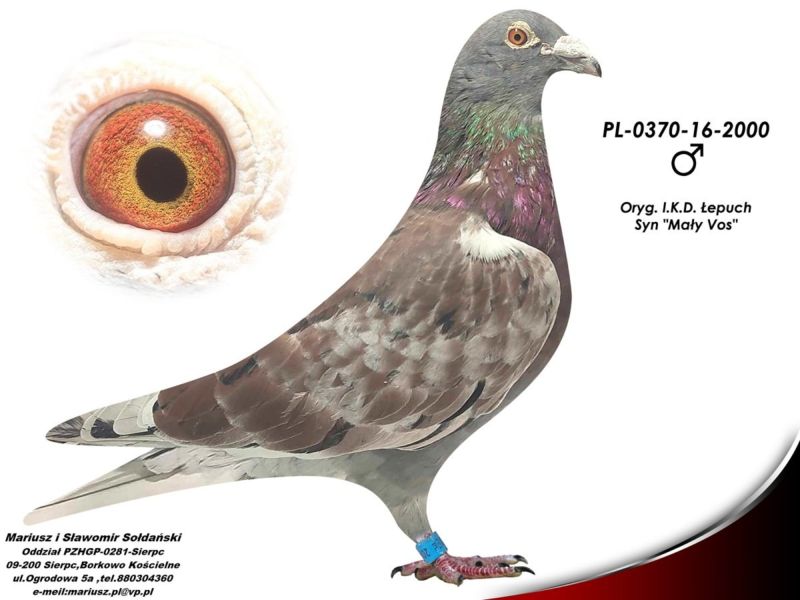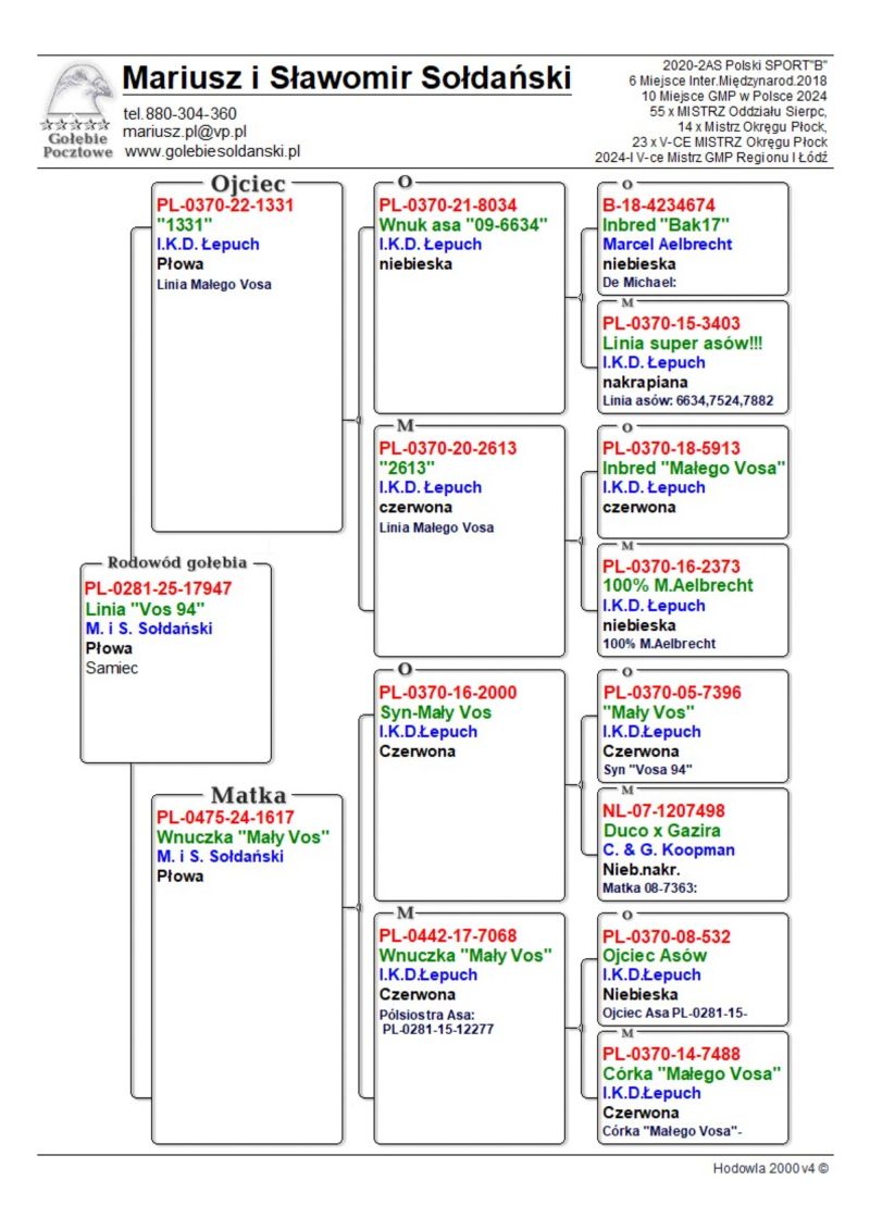 Oryginalny samiec z hodowli M. i S. Sołdańscy super Linia "Vos 94" I.K.D. Łepuch . Więcej informacji o gołębiu pod nr tel. i poniższych materiałach. Nasze wyniki w Mistrzostwie Polski 2018: 6 Miejsce w Intermistrzostwie Międzynarodowym - coeff. 151,73; 23 Miejsce GMP - 1874,73; 29 Miejsce Kat.B - coeff. 86,45. 1 Miejsce Gołąb Średni dystans-Konkurs Redakcji "Hodowca", 1 Miejsce Kat."B"-Konkurs Redakcji "Dobry Lot", 3 Miejsce Kat."D"-Konkurs Redakcji "Dobry Lot", 2 Miejsce "Mistrzostwo Asów Allround"-Konkurs Redakcji "Dobry Lot", 1 Miejsce Kat."B"-Konkurs Redakcji "Poradnik Hodowcy". 2019-Oddział Sierpc: Typowane Mistrz, Open I-vce Mistrz, Open 50 II-V-ce Mistrz, 1 i 3 Lotnik Roczny, Kat. A II V-ce Mistrz, Kat. B II V-ce Mistrz, Kat. D II V-ce Mistrz, Kat. GMP I v-Ce Mistrz, Kat. Inter. I V-ce Mistrz, Super. I V-ce Mistrz. Okręg Płock: II V-ce Mistrz Supermistrzostwo, I V-ce Mistrz GMP, II Lotnik. kat. B. 10 Gołębi w Reprezentacji Okręgu na Wystawę Ogółnopolską 2020. 2 AS POLSKI SPORT „B”-14,62 coef. 2020-Oddział Sierpc: Typowane Mistrz, Open I-vce Mistrz, Open 50 I-V-ce Mistrz, 1 Lotniczka Roczna, Kat. C Mistrz, Kat. M II V-ce Mistrz, Kat. D II V-ce Mistrz, Kat. GMP Mistrz, Kat. Inter. II V-ce Mistrz, Mistrz. Okręg Płock: Kat. GMP Mistrz , Kat.Roczne Mistrz, Kat. C-I Vce Mistrz , Kat. M - I Vce Mistrz Mistrz.Regionu I Łódż- V-ce Mistrz „Roczne” 2021- Supermistrz Oddziału Sierpc Mistrz Okręgu Płock Kat." Maraton" Supermistrz Okręgu Płock,2022 6 gołębi w reprezentacji Okręgu Płock na Wystawę Ogólnopolską.2022- II Supermistrz Oddziału Sierpc, 8 x V-ce Mistrz Oddziału. 1 AS WG Kaszuby 2022, 2 drużyna WG Kosakowo 2022, 4 AS WG Kosakowo. 6 AS WG Roztocze 2022. 6 gołębi w reprezentacji Okręgu Płock na Wystawę Ogólnopolską 2023. 2022-1 Samica w Polsce PL-0281-17-3077 w Kat. "Supermaraton"- Konkurs Redakcji"Hodowca". 2024 - 10 Miejsce w Polsce w kat. GMP 1 Miejsce Finał Wg Zatoka Puck 3 i 6 As Zatoka Puck