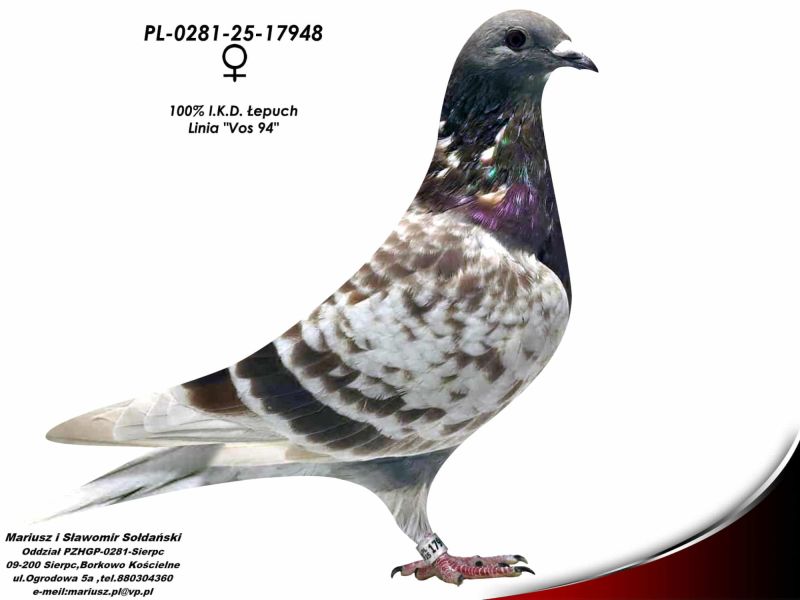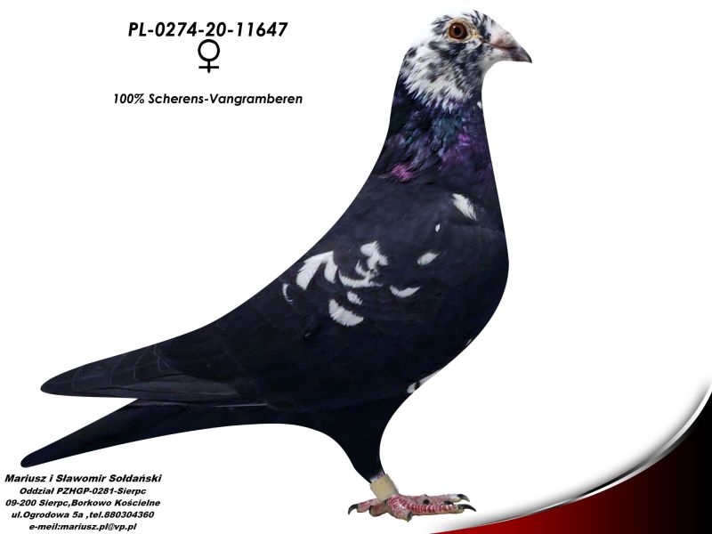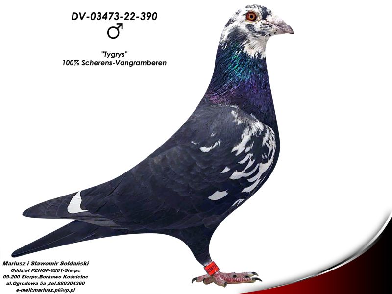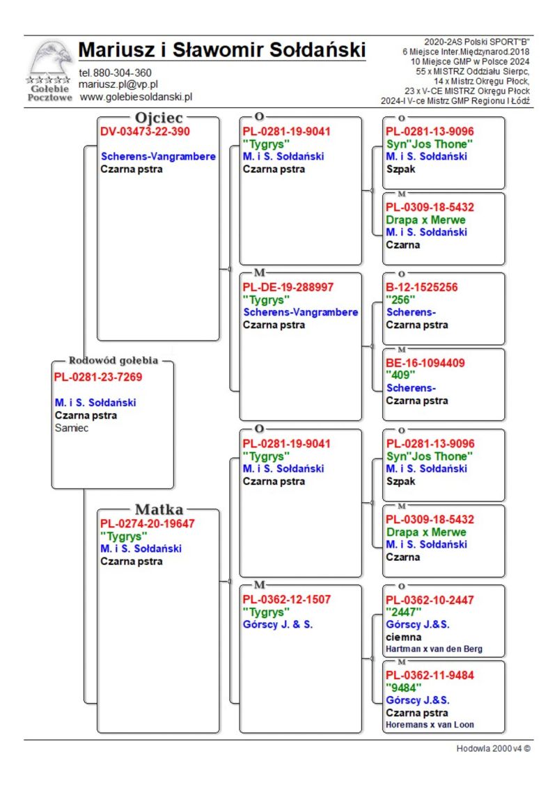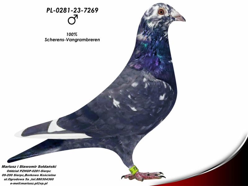 Oryginalny samczyk z hodowli M. i S. Sołdańscy - Linia Scherens-Vangramberen.Gołąb z 2025 roku. Więcej informacji o gołębiu pod nr tel. i poniższych materiałach. Nasze wyniki w Mistrzostwie Polski 2018: 6 Miejsce w Intermistrzostwie Międzynarodowym - coeff. 151,73; 23 Miejsce GMP - 1874,73; 29 Miejsce Kat.B - coeff. 86,45. 1 Miejsce Gołąb Średni dystans-Konkurs Redakcji "Hodowca", 1 Miejsce Kat."B"-Konkurs Redakcji "Dobry Lot", 3 Miejsce Kat."D"-Konkurs Redakcji "Dobry Lot", 2 Miejsce "Mistrzostwo Asów Allround"-Konkurs Redakcji "Dobry Lot", 1 Miejsce Kat."B"-Konkurs Redakcji "Poradnik Hodowcy". 2019-Oddział Sierpc: Typowane Mistrz, Open I-vce Mistrz, Open 50 II-V-ce Mistrz, 1 i 3 Lotnik Roczny, Kat. A II V-ce Mistrz, Kat. B II V-ce Mistrz, Kat. D II V-ce Mistrz, Kat. GMP I v-Ce Mistrz, Kat. Inter. I V-ce Mistrz, Super. I V-ce Mistrz. Okręg Płock: II V-ce Mistrz Supermistrzostwo, I V-ce Mistrz GMP, II Lotnik. kat. B. 10 Gołębi w Reprezentacji Okręgu na Wystawę Ogółnopolską 2020. 2 AS POLSKI SPORT „B”-14,62 coef. 2020-Oddział Sierpc: Typowane Mistrz, Open I-vce Mistrz, Open 50 I-V-ce Mistrz, 1 Lotniczka Roczna, Kat. C Mistrz, Kat. M II V-ce Mistrz, Kat. D II V-ce Mistrz, Kat. GMP Mistrz, Kat. Inter. II V-ce Mistrz, Mistrz. Okręg Płock: Kat. GMP Mistrz , Kat.Roczne Mistrz, Kat. C-I Vce Mistrz , Kat. M - I Vce Mistrz Mistrz.Regionu I Łódż- V-ce Mistrz „Roczne” 2021- Supermistrz Oddziału Sierpc Mistrz Okręgu Płock Kat." Maraton" Supermistrz Okręgu Płock,2022 6 gołębi w reprezentacji Okręgu Płock na Wystawę Ogólnopolską.2022- II Supermistrz Oddziału Sierpc, 8 x V-ce Mistrz Oddziału. 1 AS WG Kaszuby 2022, 2 drużyna WG Kosakowo 2022, 4 AS WG Kosakowo. 6 AS WG Roztocze 2022. 6 gołębi w reprezentacji Okręgu Płock na Wystawę Ogólnopolską 2023. 2022-1 Samica w Polsce PL-0281-17-3077 w Kat. "Supermaraton"- Konkurs Redakcji"Hodowca". 2024 - 10 Miejsce w Polsce w kat. GMP 1 Miejsce Finał Wg Zatoka Puck 3 i 6 As Zatoka Puck