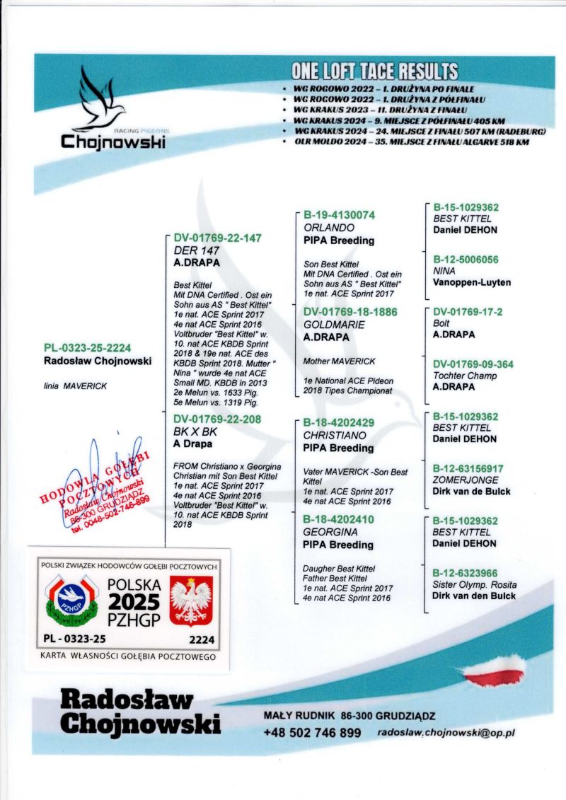 Ojciec oferowanego gołębia to półbrat MAVERICK, matka pół siostra MAVERICK złotego medalisty z hodowli A. Drapa. Oferowany gołąb to prawdopodobnie SAMICZKA. Koszt transportu 100 zł .