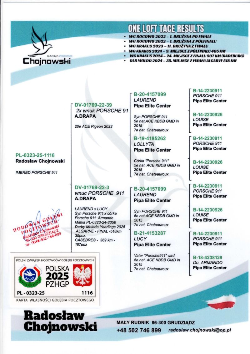 Ojciec oferowanego gołębia to wnuk PORSCHE 911 zakupiony z hodowli A.Drapa. Matka to wnuczka PORSCHE 911 zakupiona z hodowli A.Drapa. Oferowany gołąb to prawdopodobnie SAMICZKA. Koszt transportu 100 zł .Gołąb wychowany z boksu indywidualnego