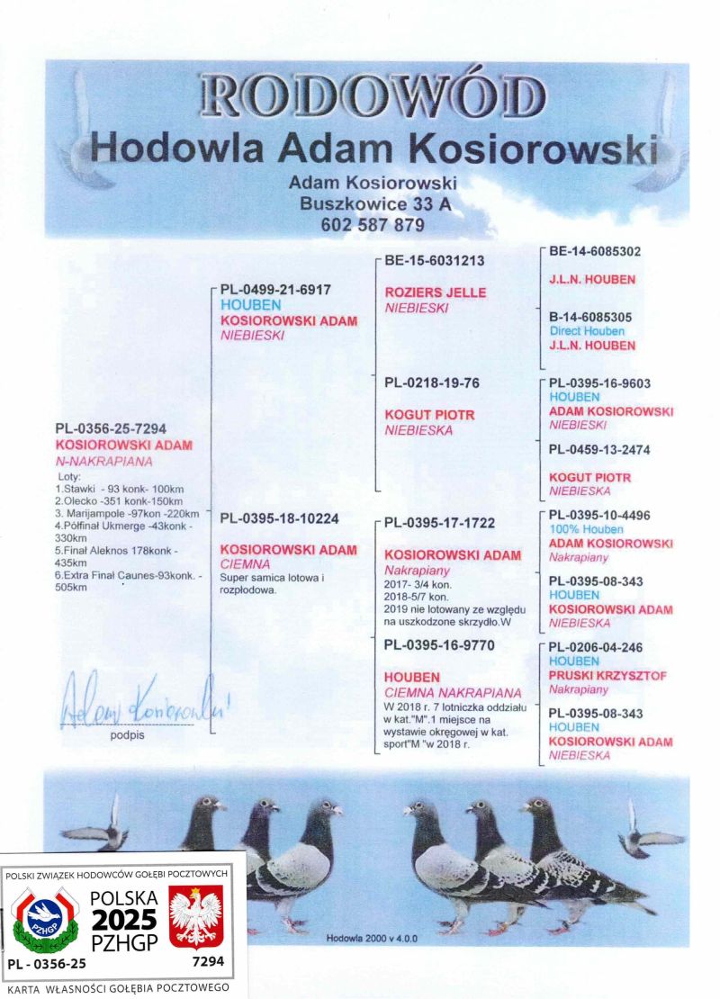 Uczestnik WG Warmia 2025, sezon VIII. Loty z kierunku północny wschód, Litwa. 178 z Finału, 175 AS, 93 z Extra Finału. Szczegóły pochodzenia w rodowodzie.