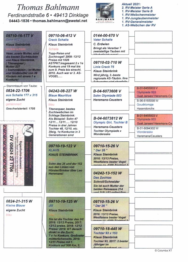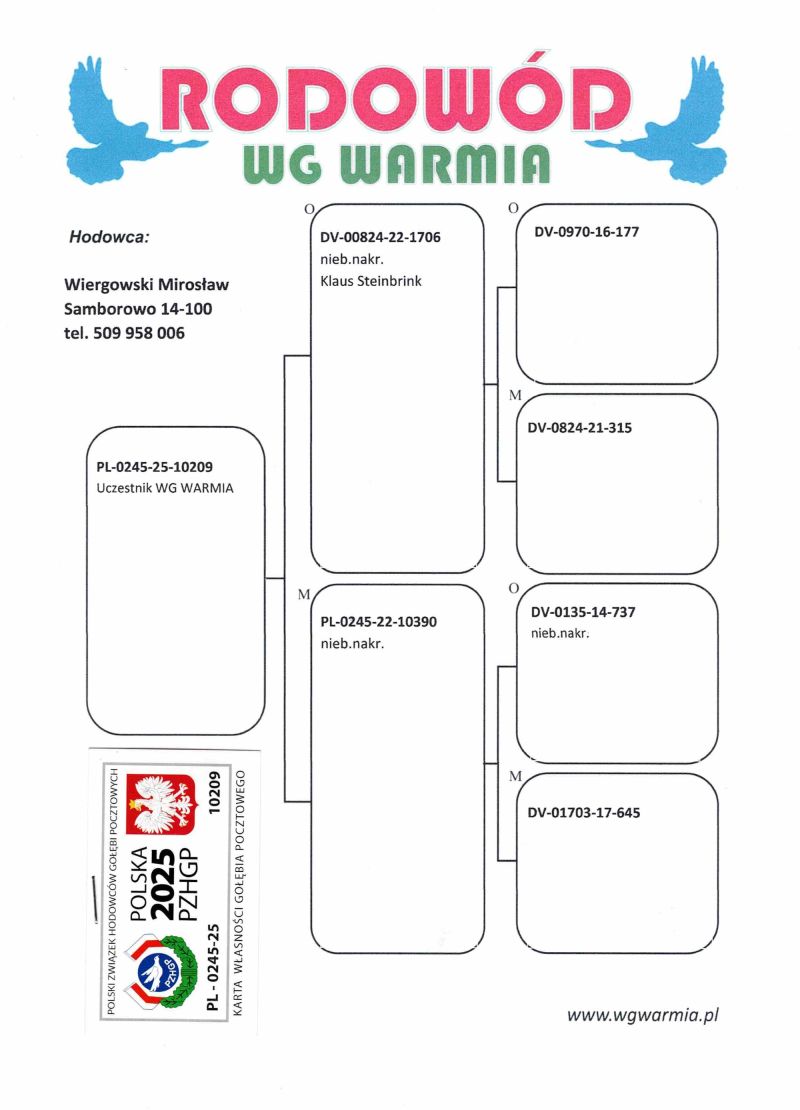 Uczestnik WG Warmia 2025, sezon VIII. Loty z kierunku północny wschód, Litwa. 144 z Finału, 412 AS, 86 z Extra Finału. Szczegóły pochodzenia w rodowodzie.