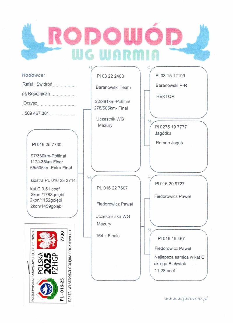 Uczestnik WG Warmia 2025, sezon VIII. Loty z kierunku północny wschód, Litwa. 117 z Finału, 216 AS, 65 z Extra Finału. Szczegóły pochodzenia w rodowodzie.