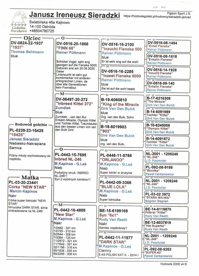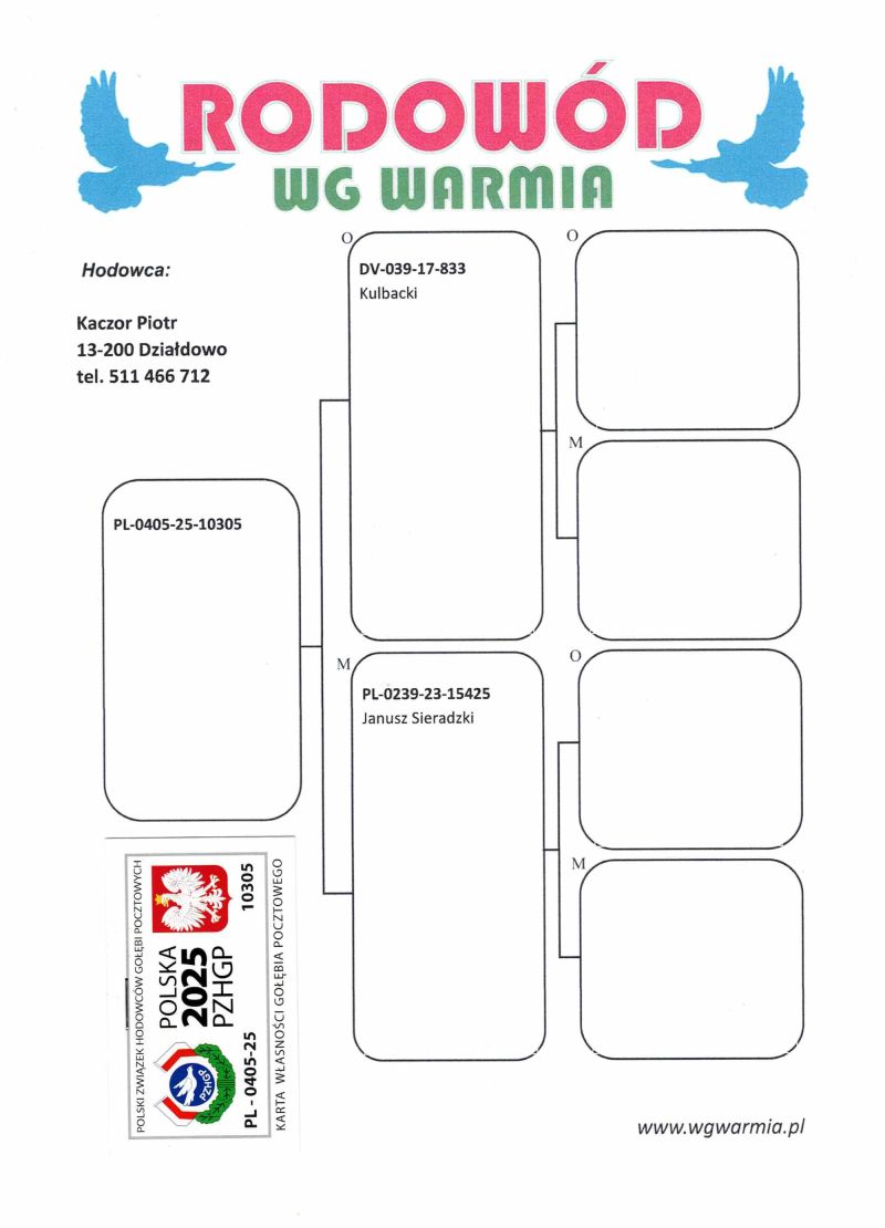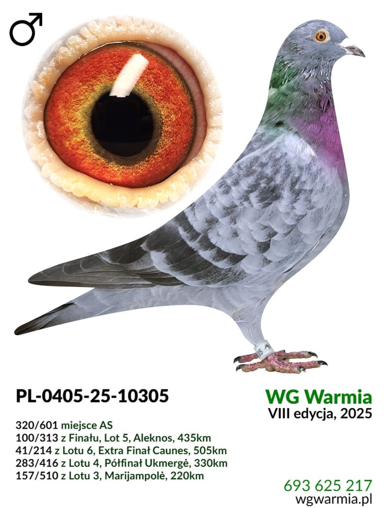 Uczestnik WG Warmia 2025, sezon VIII. Loty z kierunku północny wschód, Litwa. 100 z Finału, 320 AS, 41 z Extra Finału. Szczegóły pochodzenia w rodowodzie.
