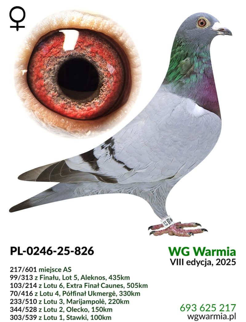 Uczestnik WG Warmia 2025, sezon VIII. Loty z kierunku północny wschód, Litwa. 99 z Finału, 217 AS, 103 z Extra Finału. Szczegóły pochodzenia w rodowodzie.