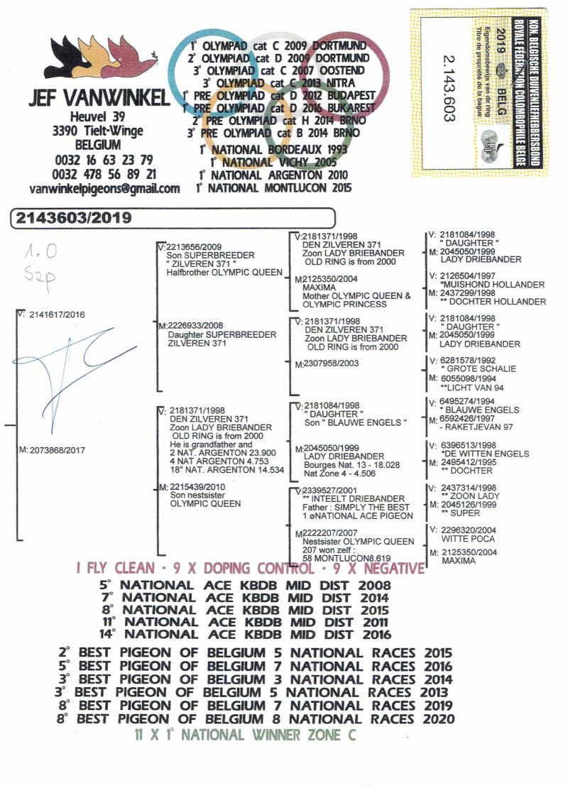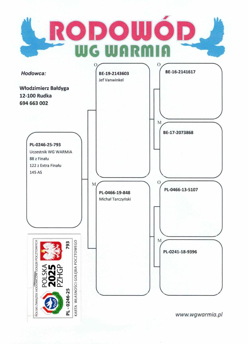 Uczestnik WG Warmia 2025, sezon VIII. Loty z kierunku północny wschód, Litwa. 88 z Finału, 145 AS, 122 z Extra Finału. Szczegóły pochodzenia w rodowodzie.