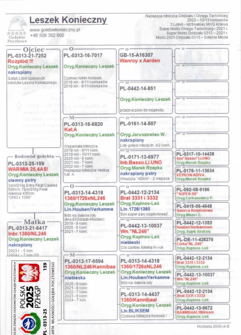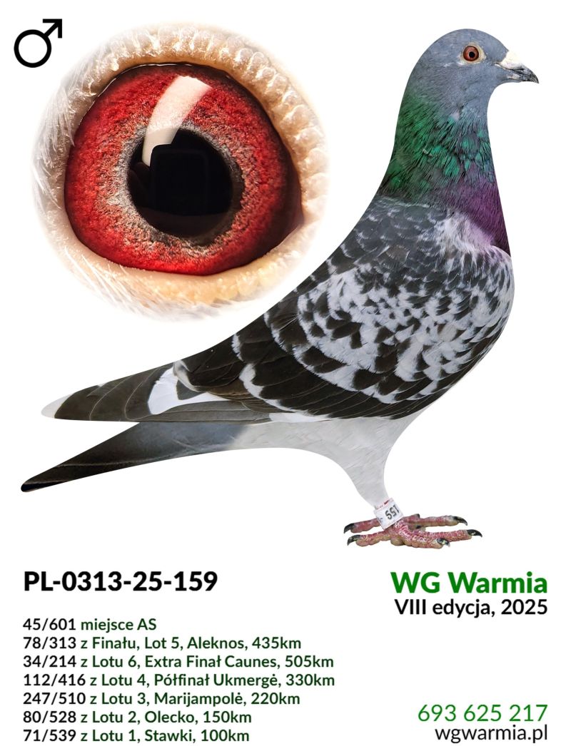 Uczestnik WG Warmia 2025, sezon VIII. Loty z kierunku północny wschód, Litwa. 78 z Finału, 45 AS, 34 z Extra Finału. Szczegóły pochodzenia w rodowodzie.