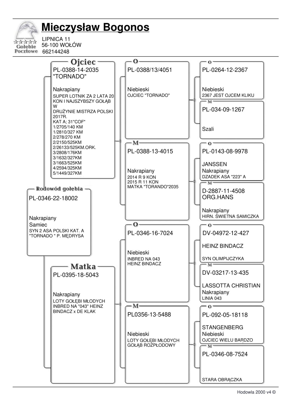 oryg. Bogonos Mieczysław, syn "Tornado" Szczegóły pochodzenia w rodowodzie i załączonych materiałach. Więcej informacji o gołębiu pod nr tel.: 662 144 248. Transport gołębia na zasadach uzgodnionych ze sprzedającym.