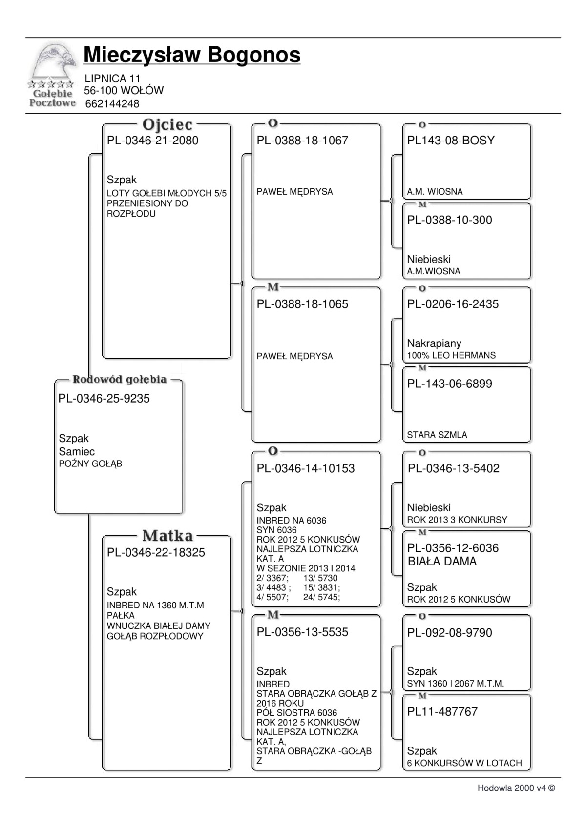 oryg. Bogonos Mieczysław (Mędrysa/ Pałka), linia "1360", "Biała Dama" Szczegóły pochodzenia w rodowodzie i załączonych materiałach. Więcej informacji o gołębiu pod nr tel.: 662 144 248. Transport gołębia na zasadach uzgodnionych ze sprzedającym.