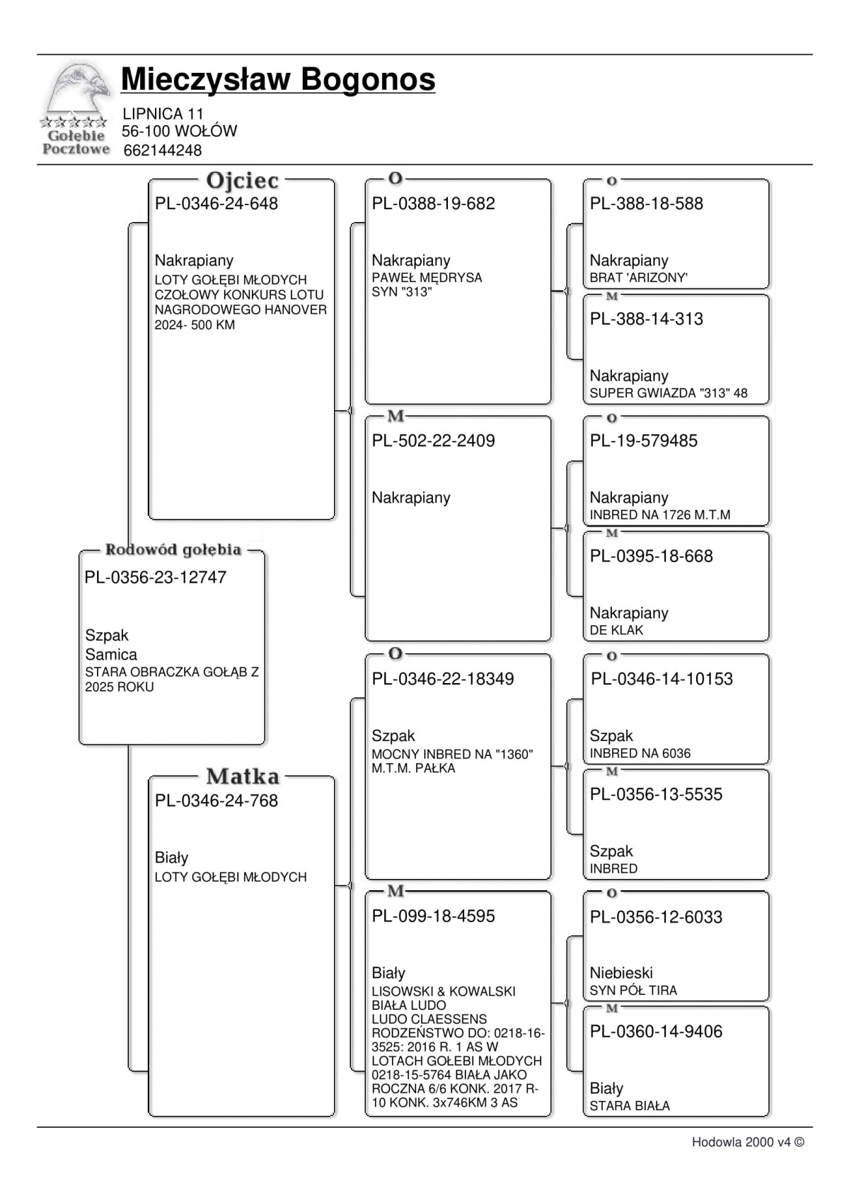 oryg. Bogonos Mieczysław (Mędrysa/ Pałka), linia "313", "Arizona", "1360" Szczegóły pochodzenia w rodowodzie i załączonych materiałach. Więcej informacji o gołębiu pod nr tel.: 662 144 248. Transport gołębia na zasadach uzgodnionych ze sprzedającym.