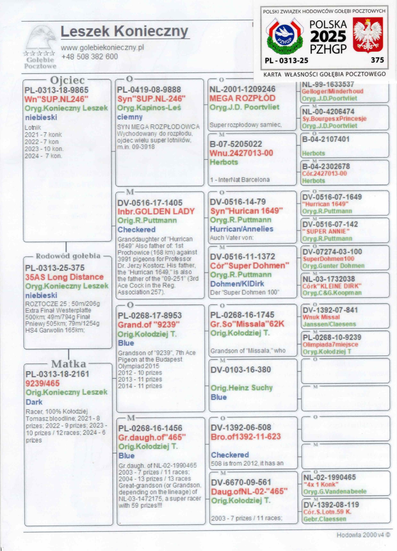 Opis: Gołąbek po całym bardzo wymagającym programie na WG ROZTOCZE 2025 loty z wiatrem pod wiatr i boczny w każdych warunkach sobie poradziły. 8 Lotów Konkursowych 2015 kkm zdobywając 49 miejsce z Finału 505km.EXTRA FINAŁ 50 MIEJSCE.10 AS i 38 AS Krótki Dystans,35 AS Dalekodystansowy oraz 9 Drużyna 2x500km więcej info.w rodowodzie i na stronie Benzing Live. oneloftrace.live/lofts/260?season=2458&tab=flights zapraszamy na sezon 2026. Dostawa wylicytowanego gołębia na terenie Polski 160zł.