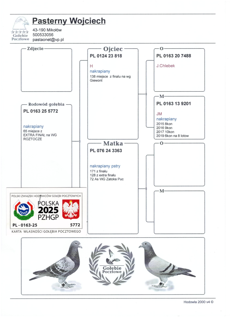 PL-0163-25-5772 WG ROZTOCZE FINAŁ 368poz.505km Extra Finał 65poz 31 Drużyna 2x500km