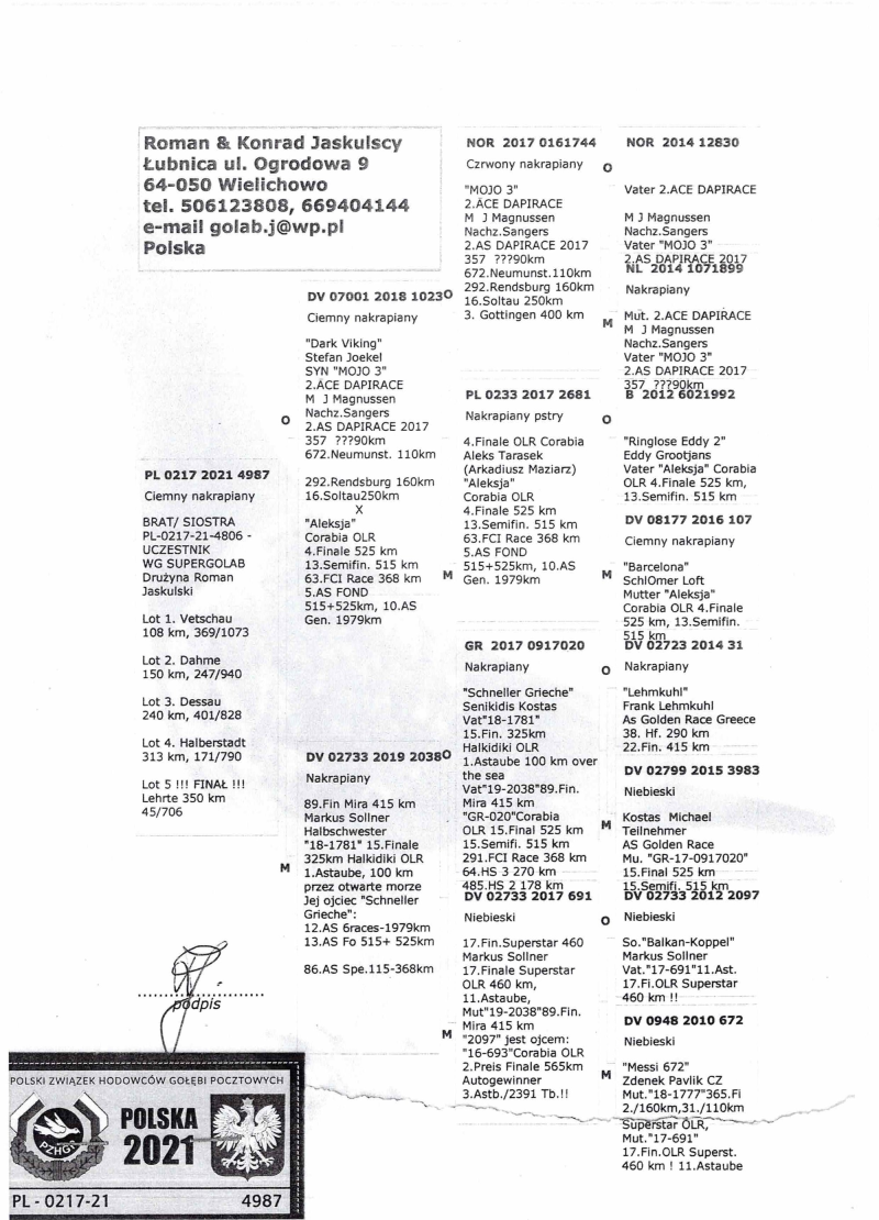 więcej info.w rodowodzie i na stronie Benzing Live. oneloftrace.live/lofts/260?season=2458&tab=flights