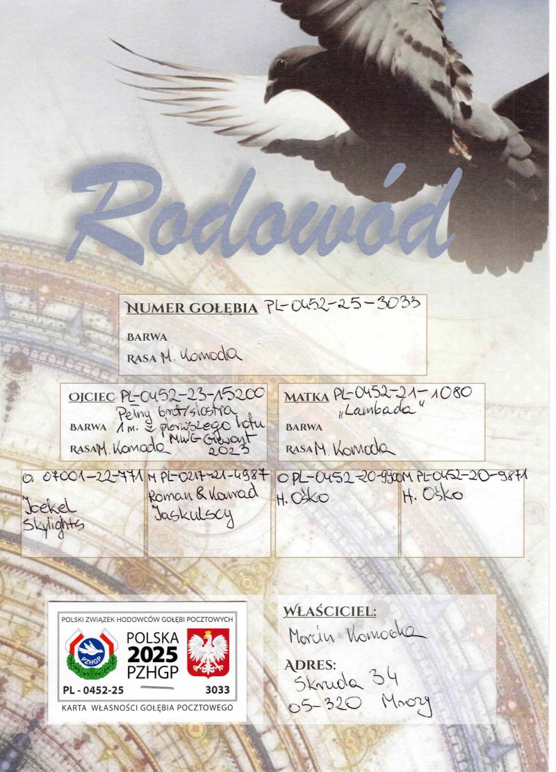 Płeć: samiec Hodowca - rasa: Oryg.STANDZIAK JAKUB-KOMODA MARCIN Zakończenie: 3.11.2025 godz. 19:54