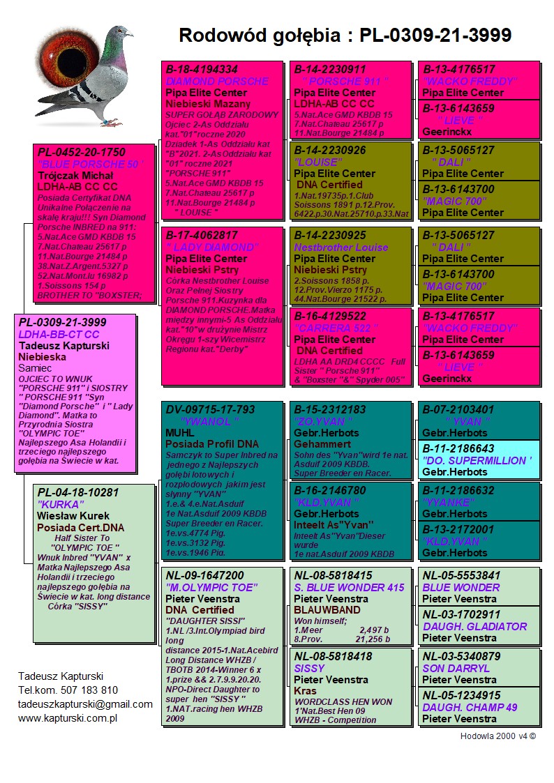 Oryginalny gołąb z hodowli Tadeusza Kapturskiego. Szczegóły pochodzenia w rodowodzie. Więcej informacji pod nr tel.: 507183810 ***transport kurier 165 zł ***NA ŻYCZENIE CERTYFIKAT DNA