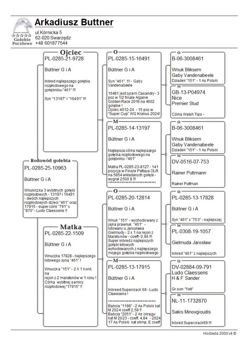 Wnuk/czka 3 wybitnych gołębi rozpłodowych - 13197 i 16491 - dwóch najlepszych rozpłodowych dzieci "461" oraz 17915 - super córki "791" x "870" - Ludo Claessens !! "791" - ojciec "ZigZag McQueen" - 117 poz w finale SAMDPR , ojciec "Lotniskowej" , najlepszej samicy rozpłodowej u Kol Krzyśka Kusia oraz dziadek 8755 - rezerwa na olimpiadę w kat olimpijskiej maraton . Jest też pradziadkiem PL-0122-22-2219 - w 2 sezony na 21 wkładań 20 konkursów - kat A coeff 9,08 a z dwóch lat do wystaw kat A-74,86 , kat B-65,94 a kat D-72,20 W 2023 roku zdobył 1 konk na ok 4100 gołębi z miejsc Sulechów a w 2024 roku 2 x 2 konk w oddz !!! oraz PL-0122-22-5510 w kat A w 2024 roku uzyskał coeff. 4,75 Zdobył też 1 konk na oddz z miejsc. Brzeg Dolny na 4322 gołębie !! Został też 4 Asem Polski kat krótki dystans 2024 z coeff 17 z groszem z 5 lotów do kat A właśnie dla Kolegi Jacka Orszulika !!!oraz ojciec , dziadek i pradziadek wielu wybitnych gołębi rozpłodowych i lotowych na wielu gołębnikach !! "Felle 040" ojciec m.in 8755 , który dla Kol . Krzyśka Kusia wylatał 4 wynik w Polsce w kat olimpijskie E i był gołębiem rezerwowym na olimpiadę. Jest też pradziadkiem PL-0122-22-2219 - w 2 sezony na 21 wkładań 20 konkursów - kat A coeff 9,08 a z dwóch lat do wystaw kat A-74,86 , kat B-65,94 a kat D-72,20 W 2023 roku zdobył 1 konk na ok 4100 gołębi z miejsc Sulechów a w 2024 roku 2 x 2 konk w oddz !!! oraz PL-0122-22-5510 w kat A w 2024 roku uzyskał coeff. 4,75 Zdobył też 1 konk na oddz z miejsc. Brzeg Dolny na 4322 gołębie !! Został też 4 Asem Polski kat krótki dystans 2024 z coeff 17 z groszem z 5 lotów do kat A właśnie oraz także pradziadkiem PL-0122-21-2246 - na 16 wkładań 16 konkursów i w 2024 roku uzyskał kat A - 10,32 coeff , kat B - 8,64 coeff a z dwóch lat do wystaw kat A 53 coeff i został na ostatniej wystawie TYTUŁ 17 ASA POLSKI , w kat olimp B - 67,76 coeff a w kat D - 53,20 coeff a w 2024 roku w kat średni dystans został w/g konkursu redakcji ZOSTAŁ 9 ASEM A TAKŻE WYGRAŁ Z LOTU OKRĘGOWEGO NA 8137 GOŁĘBI Z LOTU ŚWINOUJŚCIE + 500 KM i pradziadkiem PL-0122-22-5118 uzyskał w tym 2024 roku coeff 5,24 w kat A oraz w 2023 roku 2 konk na oddział z lotu Bieganów na ok 3000 gołębi oraz 2 konkurs na oddział w 2024 rokuz miejscowości Kościan na około 4300 gołębi dla Kolegi Jacka Orszulika !!!"Felle" jest też ojcem dziadkiem wielu innych super gołębi lotowych - asów na szczeblu sekcji , oddziału i okręgu oraz gołębi ropzłodowych ! "870" - matka 14196 - 2 as oddz kat A , 8701 - ojciec 2 x 10 gołąb z finału WG Kuźnica 2015 i 2016 , i wielu wielu innych innych.Babka 1 gołębia z finału WG Podhale 2024 dla Kol. Bogdana Bieli. Babka super samca rozpłodowego u Kol Jacka Orszulika, matka "17915" - "17915" - wybitna samica rozpłodowa - babka dwóch mega lotników na PLGP u Kol Krzysztofa Mrowieca oraz babka 2 super samic Lotowych u Kol Kazimierza Goździejewskiego ( jedna w kat M w 2023 roku miała coeff 4,84 a druga w 2024 roku 2,58 - 2 x 1 na oddział - w kat "I" - coeff 9 z haczykiem) "461" najważniejsze referencje z 2024 roku: 1 As Rejonu z 8 lotów rejonowych - prawnuczka 461 u Kol Adama Gasperowicza, prawnuk "461" wygrał finał na WG Podhale wygrywając 50 000 dla Kolegi Bogdana Bieli !- liczba jedynek jego wnuków , prawnuków i oczywiście dzieci będzie około stu a kilkadziesiąt gołębi z 461 zajmowało top 10 w kat As w różnych kategoriach w różnych okręgach w Polsce- tylko w 2022 roku w 9 różnych oddziałach przeważnie prawnuki zdobywały 1 lokatę w oddz !!! Jego wnuczka została też na olimpiadzie w tym roku 4 gołębiem świata w kat H dla Kol Łukasza Reguły. !! Na screenie przykład jak potrafią siadać gołębie w oddz z linii 461 ... 3-prawnuk,4 -wnuk , 5-wnuk , 6 - roczna wnuczka - kat A 9 z groszem ma , 7 wnuk , 11 - wnuk oraz 15 - wnuk 461. oraz kolejny lot z 2020 roku : 1,2,3,5,7,8 wnuk oraz 15 prawnuk ? do tego roczna samiczka Kolegów Piotra I Marcina Żureckich z Kępna została 6 asem Polski w kat G ...tak leciała... 2 na 5200 g ze 174 km 8 na 4573 z 219 km 8 na 3583 g z 324 km 8 na 1764 g z 324 g 21 na 4535 g z 549 km - rej - coeff jak widać na zdjęciu 13,54 miała też szósty super lot była 25 na 4984 g coeff 5,02 1 goląb z Extra finału na WG Giewont 2022 dla Teamu Chudy-Molek to też linia "461" ojciec to syn mojej super wdowy 2161-12 ,, Dwie Prawnuczki .... u Kol Kazimierza Goździejewskiego ( jedna w kat M w 2023 roku miała coeff 4,84 ( 1 as okręgu Wałbrzych a druga w 2024 roku 2,58 - 2 x 1 na oddział (2 as Polski kat M w/g miesięcznika "Hodowca") - w kat "I" - coeff 9 z haczykiem), "461" to też pradziadek PL-0122-22-2219 - w 2 sezony na 21 wkładań 20 konkursów - kat A coeff 9,08 a z dwóch lat do wystaw kat A-74,86 , kat B-65,94 a kat D-72,20 W 2023 roku zdobył 1 konk na ok 4100 gołębi z miejsc Sulechów a w 2024 roku 2 x 2 konk w oddz !!! oraz pradziadek PL-0122-22-5510 w kat A w 2024 roku uzyskał coeff. 4,75 Zdobył też 1 konk na oddz z miejsc. Brzeg Dolny na 4322 gołębie !! Został też 4 Asem Polski kat krótki dystans 2024 z coeff 17 z groszem z 5 lotów do kat A właśnie dla Kolegi Jacka Orszulika !!! oraz wiele,wiele innych.....od 2017 roku 30x mistrzostwo oddz w różnych kategoriach w tym 2019-2021 3 x z rzędu supermistrzostwo oddziału Poznań, więcej info 601 877 544