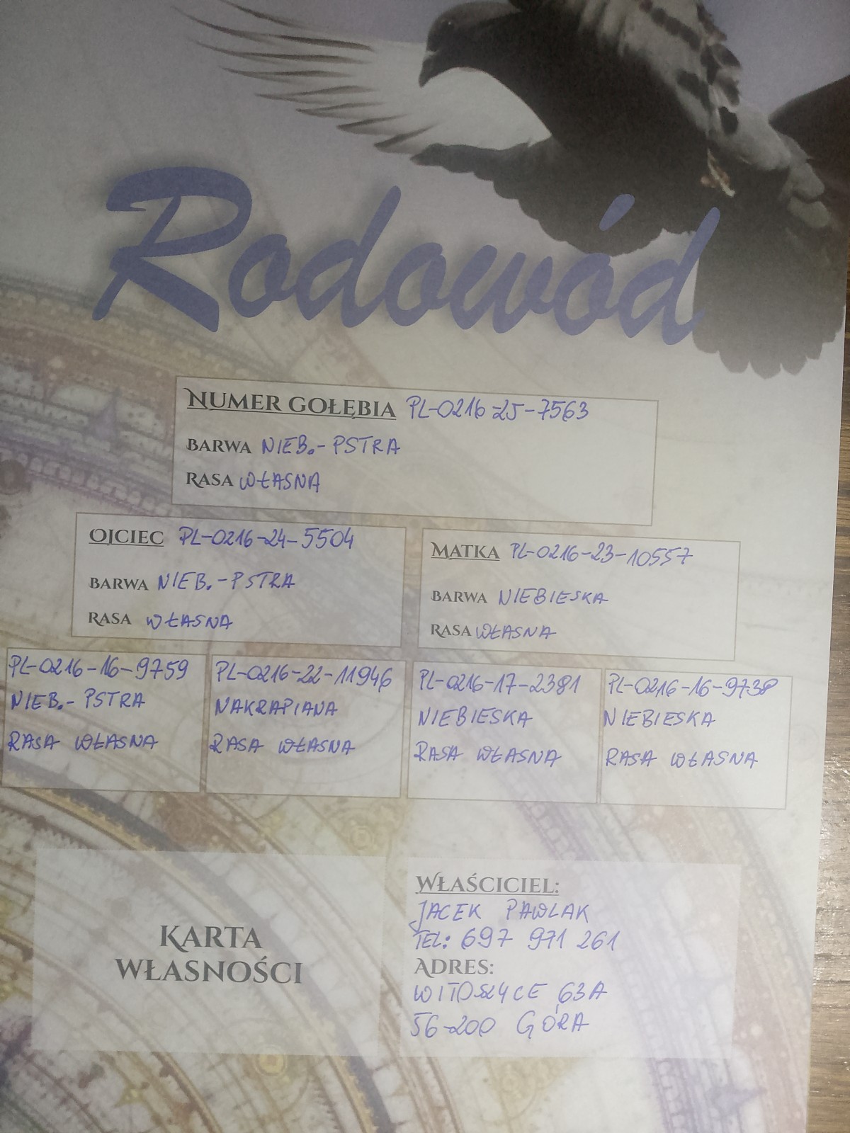 | Lot | Data | Dystans [km] | Ilość gołębi | Pozycja | Prędkość [m/min] |
