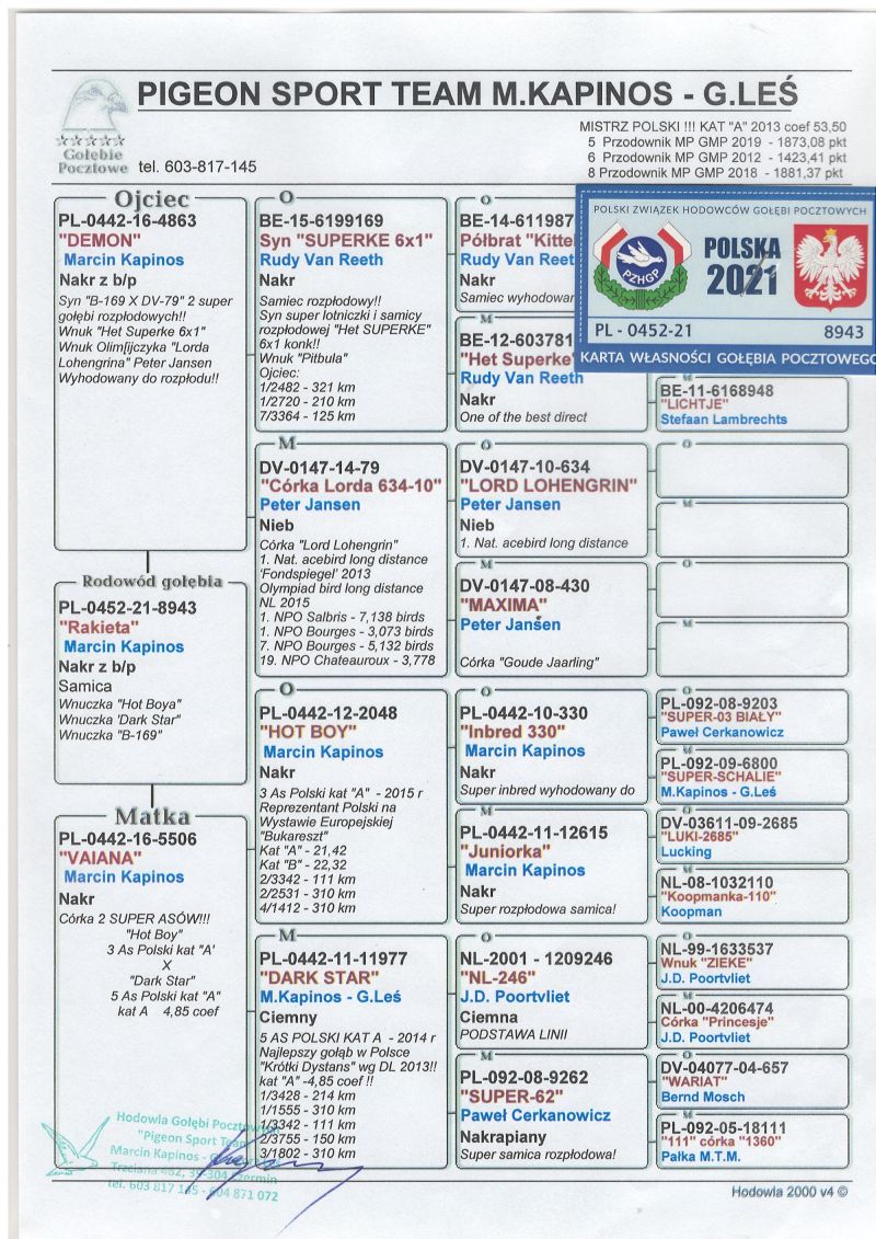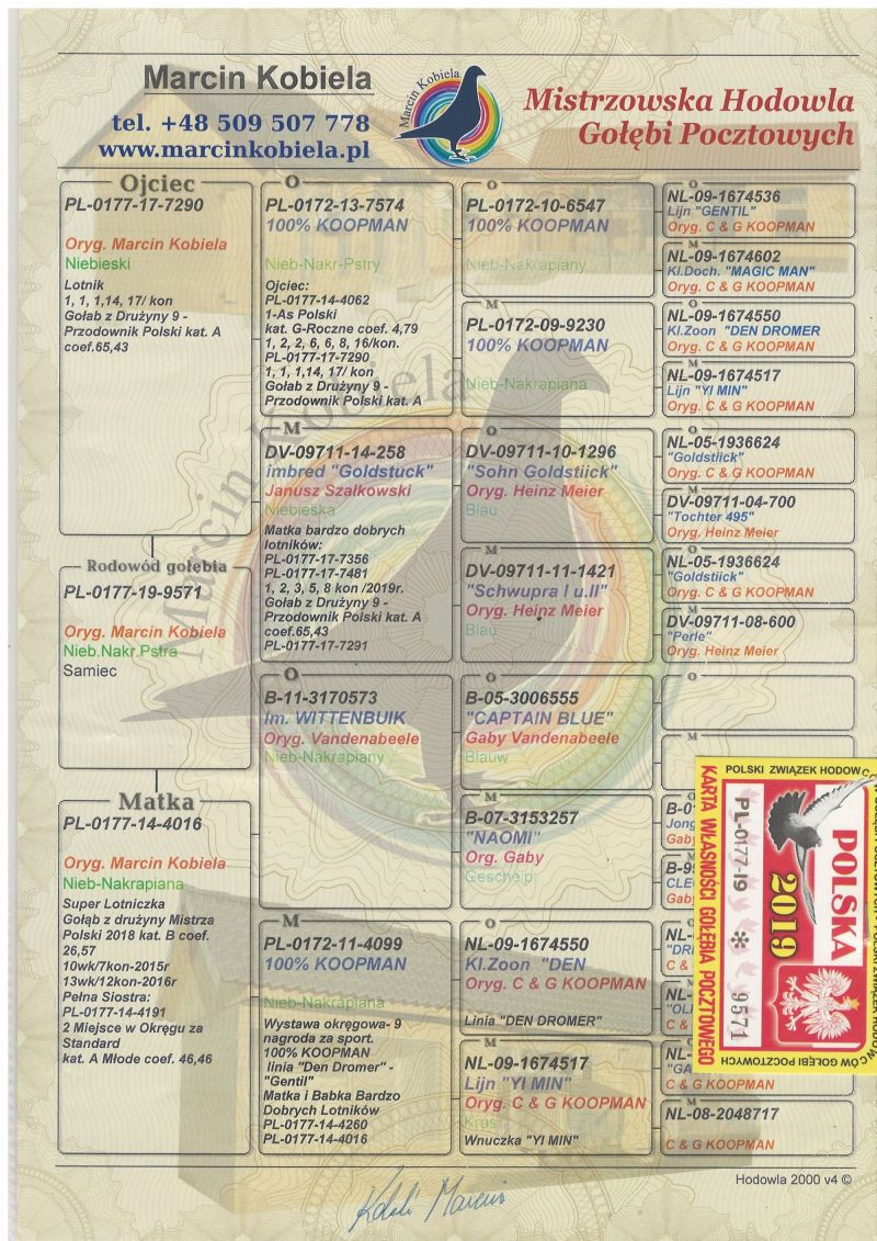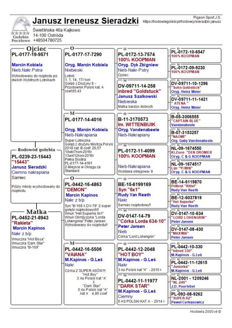 Oryginalny gołąb z hodowli Janusza Sieradzkiego. Szczegóły pochodzenia w rodowodzie. Więcej informacji pod nr tel.504780725