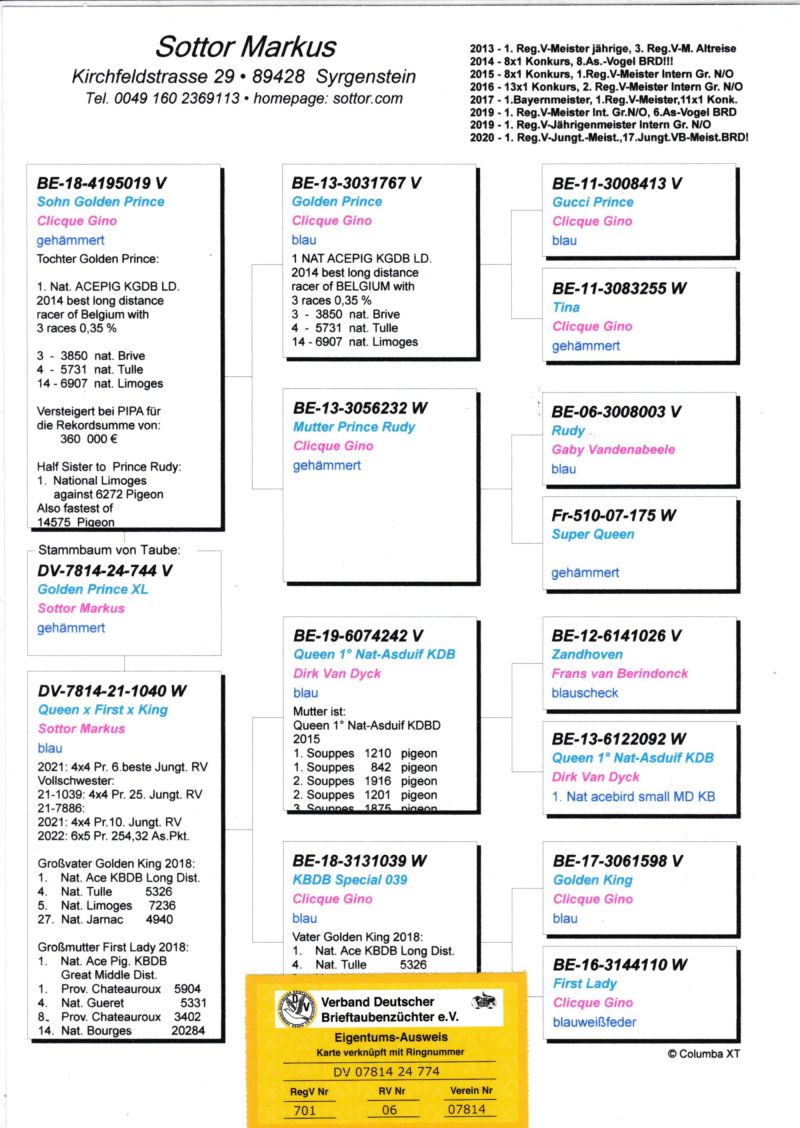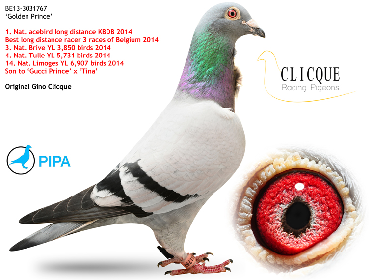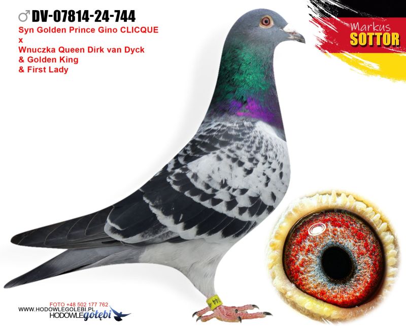 Mocny, proporcjonalnie zbudowany samczyk. Oryginał od Markusa Sottora. Samczyk to wnuk super gołębia od Gino Clicque Golden Prince. Ojciec to syn Golden Prince parowany na córkę Rudy od Gaby Vandenabeele. Natomiast matka to 6 najlepszy młody w RV, wnuczka Queen, Dirka van Dyck oraz wnuczka Golden King, Gino Clicque. Pochodzenie samczyka opisane w rodowodzie. Kontakt 503 065 248. Wysyłka przez kuriera. Koszt 100zł. Tylko wpłata na konto. Przy zakupie 3 gołębi wysyłka gratis!