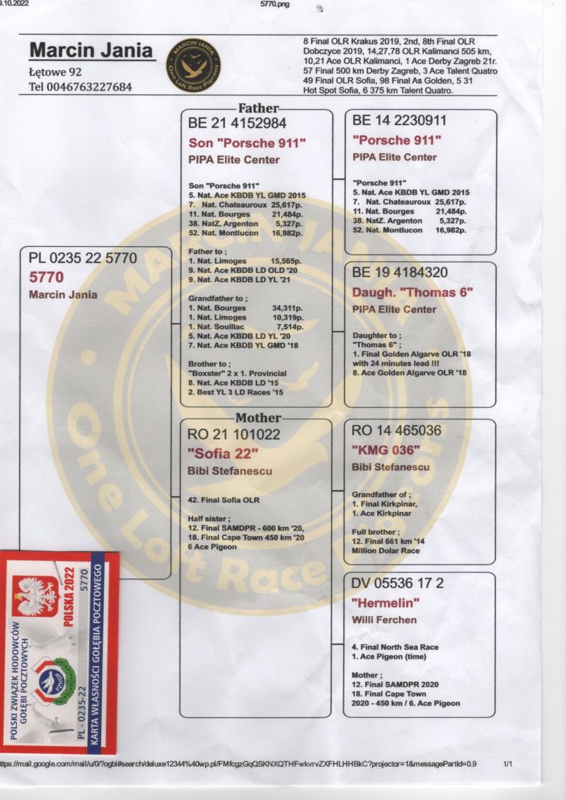 Ojciec samiczki to pełny brat gniazdowy super samicy u Huberta Ośko "Lauren Porsche" BE 21-4152983. Super materiał.