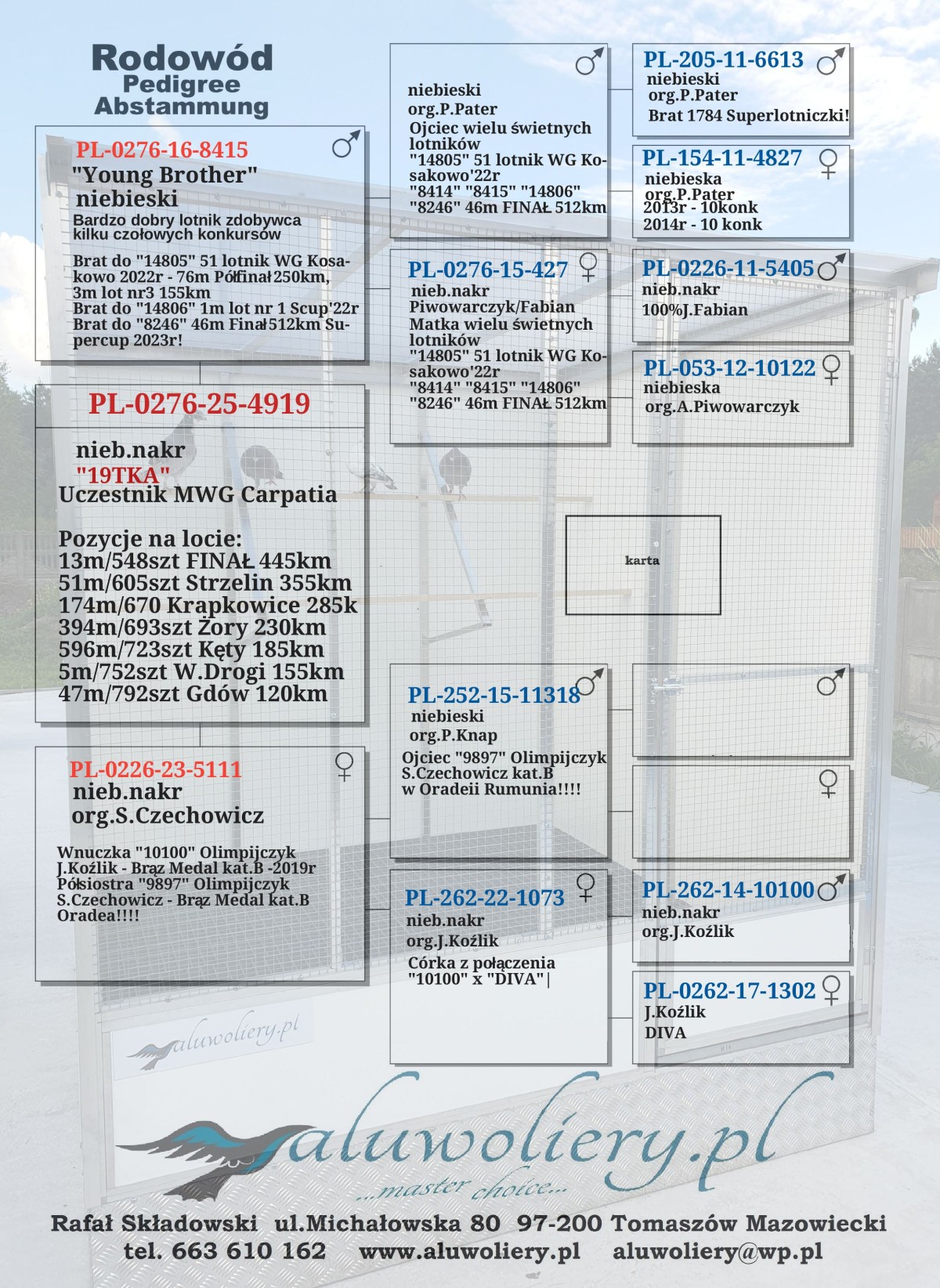 | Lot | Data | Dystans [km] | Ilość gołębi | Pozycja | Prędkość [m/min] |