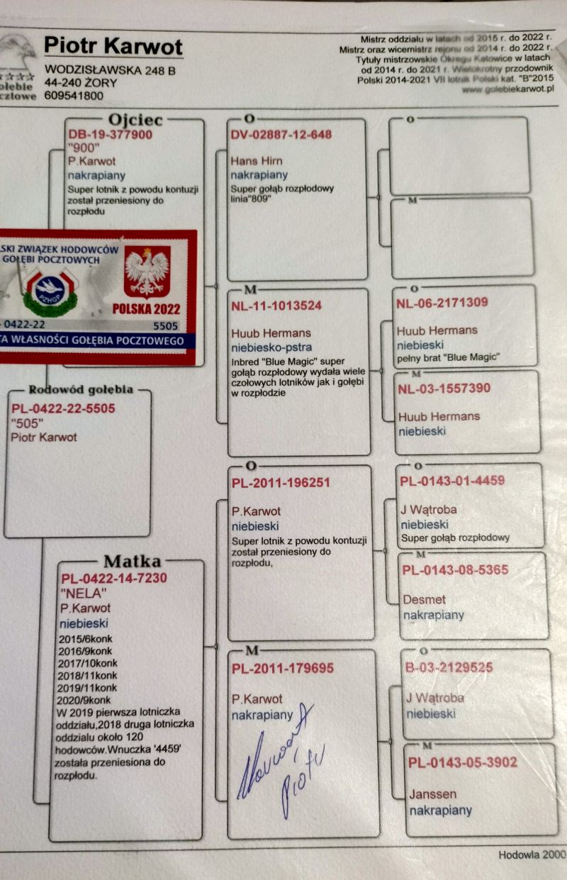 Oryginalny gołąb z hodowli Piotra Karwota. szczegóły pochodzenia w rodowodzie. Więcej informacji pod nr tel.: 535199807 **odbiór osobisty lub wysyłka po stronie kupującego