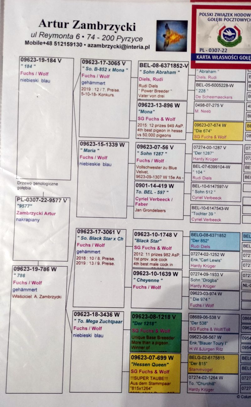 Oryginalny gołąb z hodowli Artura Zambrzyckiego. szczegóły pochodzenia w rodowodzie. Więcej informacji pod nr tel.: 535199807 **odbiór osobisty lub wysyłka po stronie kupującego