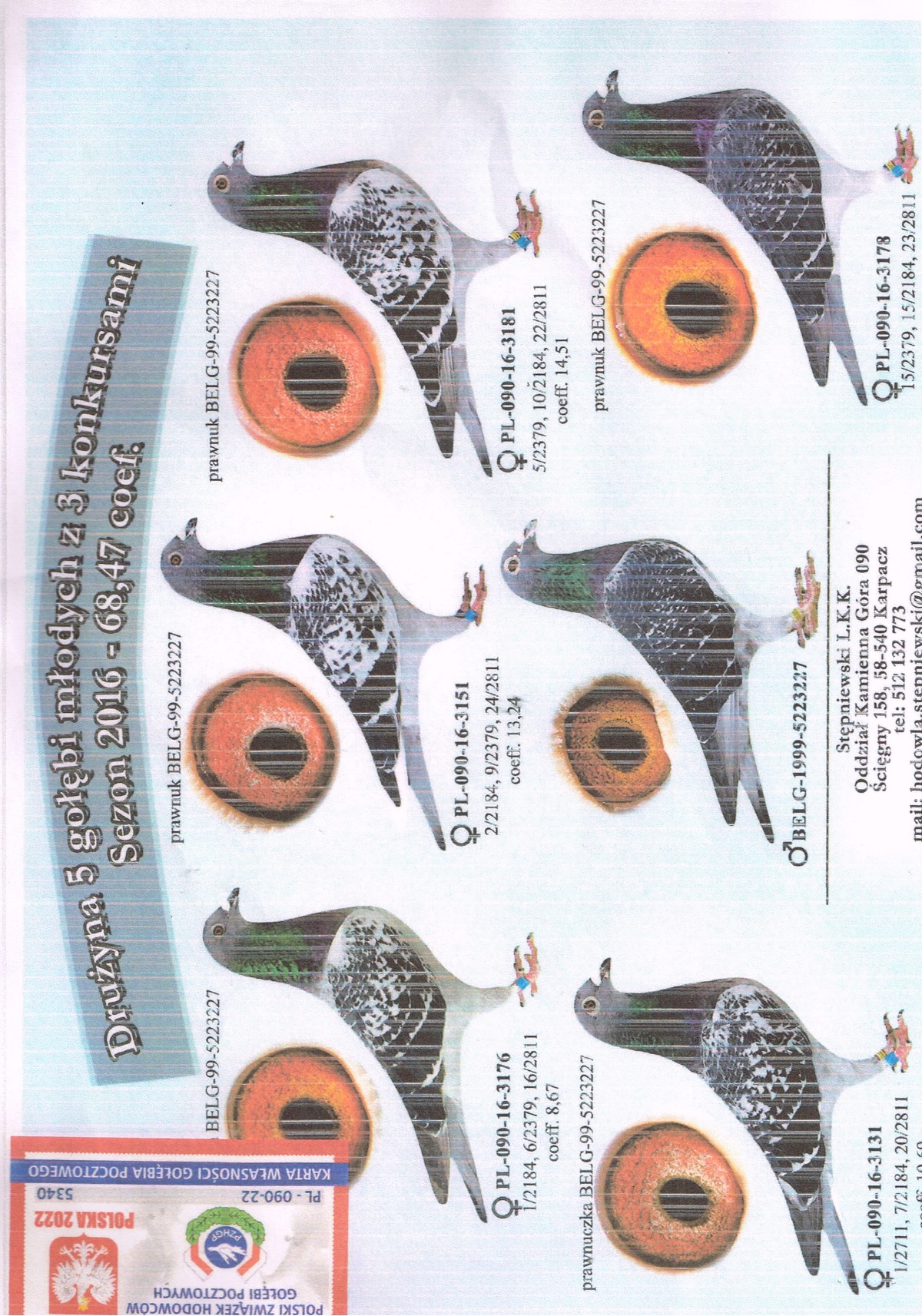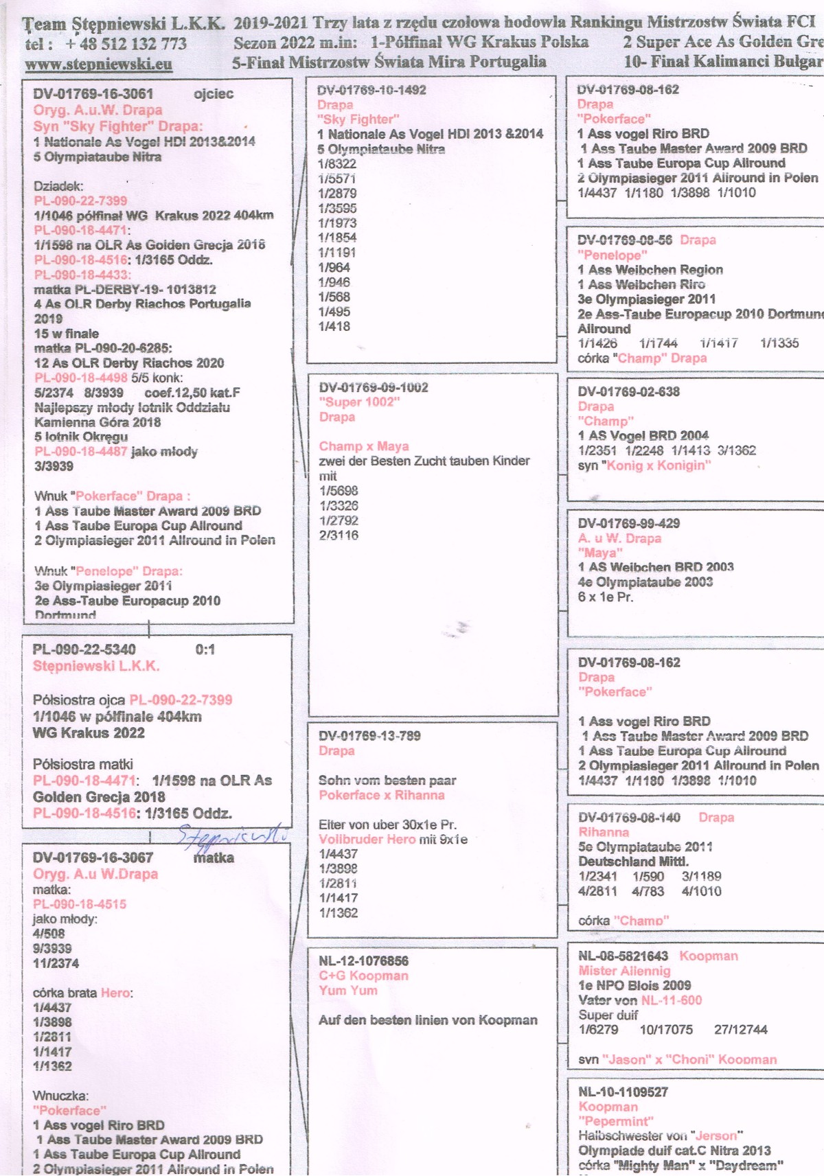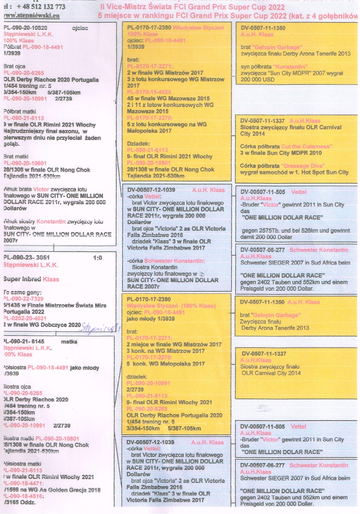 | Lot | Data | Dystans [km] | Ilość gołębi | Pozycja | Prędkość [m/min] |