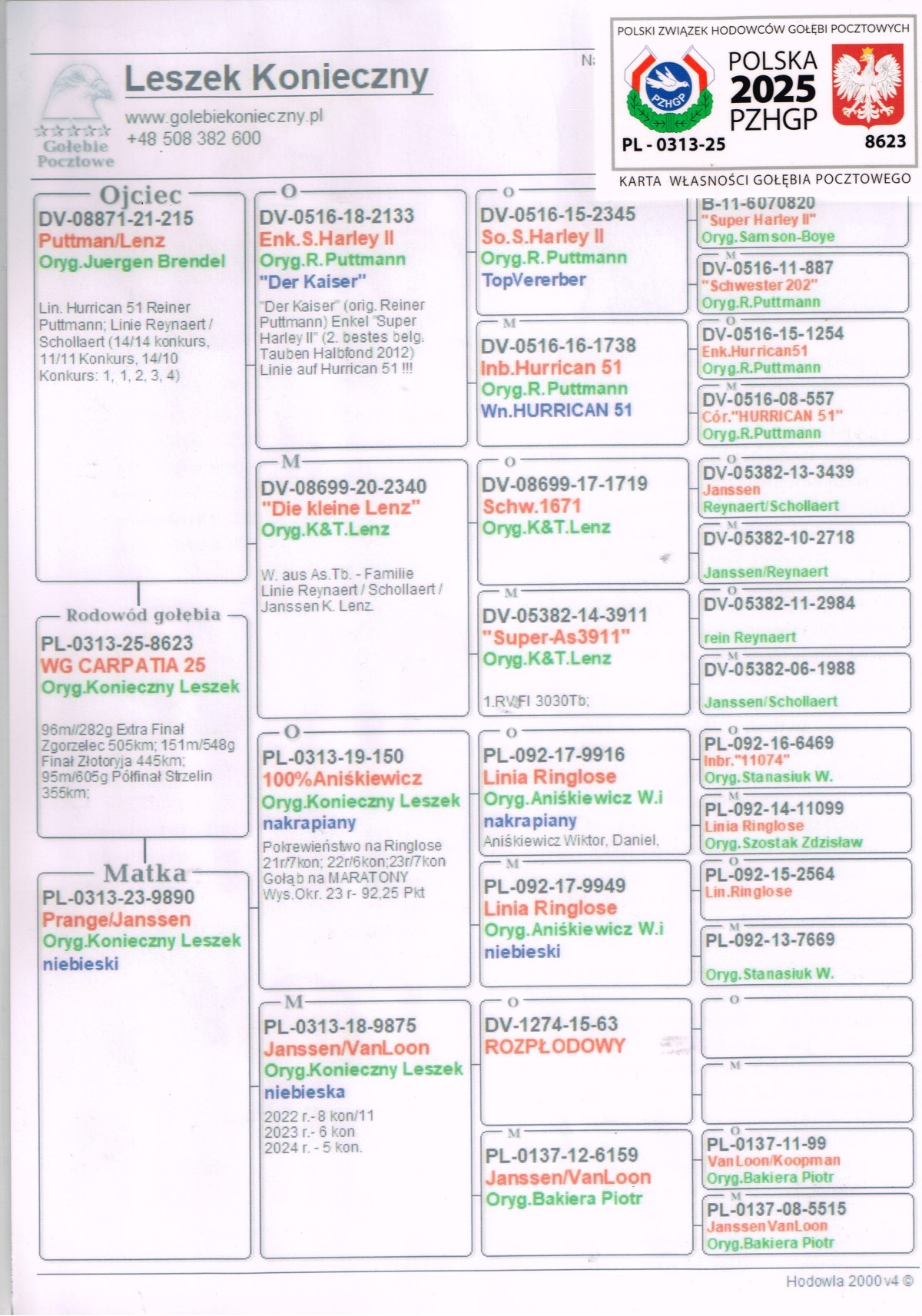 | Lot | Data | Dystans [km] | Ilość gołębi | Pozycja | Prędkość [m/min] |