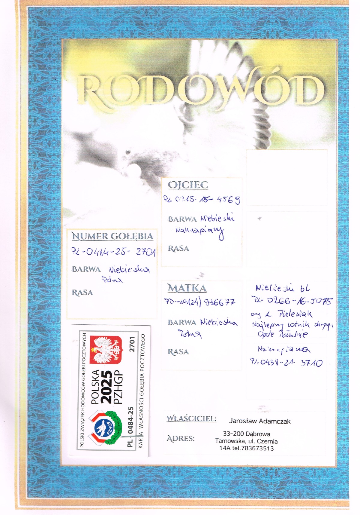 | Lot | Data | Dystans [km] | Ilość gołębi | Pozycja | Prędkość [m/min] |