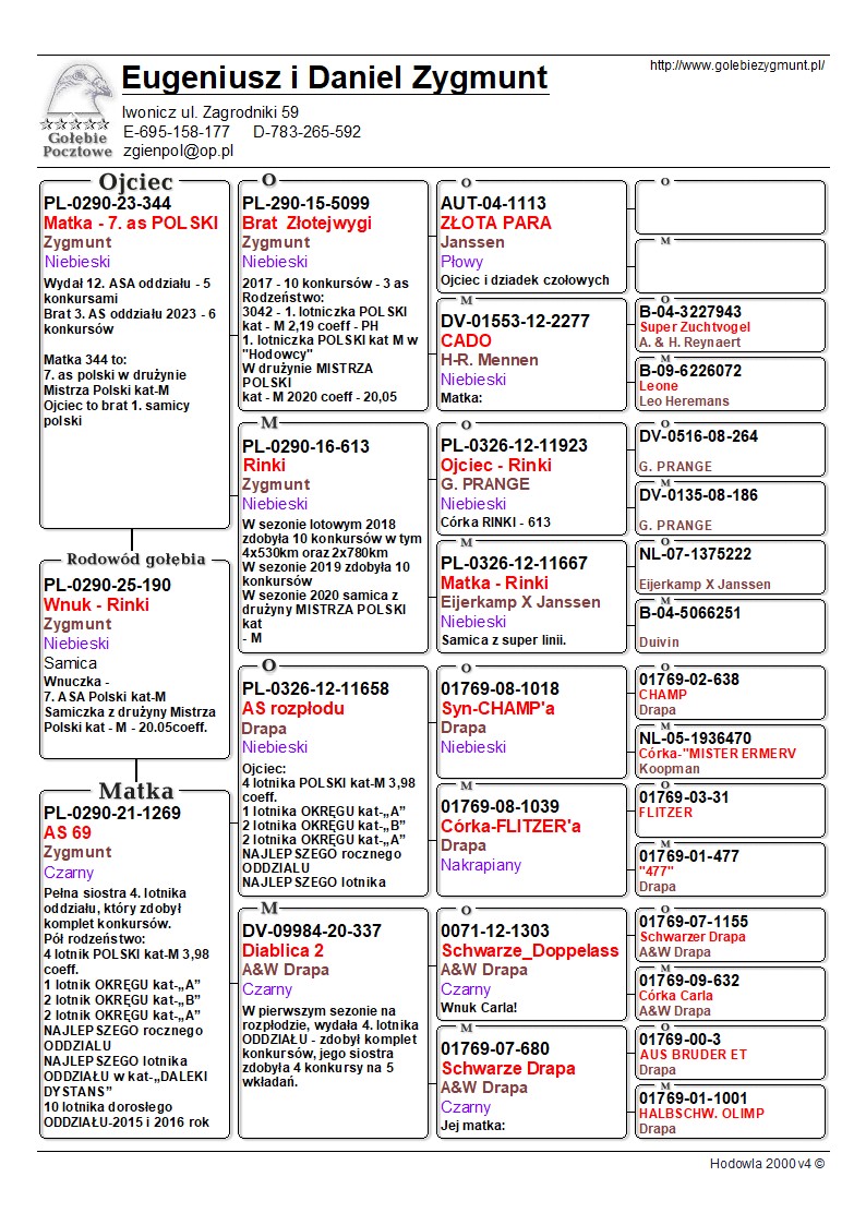 ***Transport: do 2 sztuk – 100 zł, 3–4 sztuki – 150 zł, powyżej 5 sztuk – 200 zł---Sezon 2025 przyniósł kolejne świetne wyniki – zdobyliśmy 4. i 5. miejsce w oddziale oraz tytuł II vice-mistrza oddziału w kategoriach MP oraz kat-A. Na wspólnych gołębnikach nasze ptaki pokazały klasę: 3. miejsce w finale WG Zatoka Puck, 7. AS WG Zatoka Puck, 36. AS OLR SuperCup, 33. i 86. AS OLR Mazury oraz 11. miejsce drużynowo na WG Zatoka Puck. Poprzedni sezon 2024 był jednym z najlepszych w naszej historii – 1., 3. i 4. miejsce w oddziale to wynik, jakiego jeszcze nie było. Do tego 1. i 2. miejsce w kat. MP oraz 1. w kat. A. Sezon zakończyliśmy z 9 gołębiami z 6 konkursami (w tym 5 pierwszych w oddziale) i aż 86 gołębiami z ponad 4 konkursami. Na wspólnych gołębnikach również liczne sukcesy: 2. z finału OLR Mazury, 16. z Ekstra Finału WG Zatoka Puck, 12. z MWG Rogowo, 2. z WG Zatoka Puck, 70. z finału MWG Rogowo, 43. AS Rogowo, 55. z finału OLR SuperCup, 36. AS WG Podhale, a gołąb po naszym samcu zdobył 2. miejsce w finale OLR SuperCup. Więcej informacji w rodowodach lub pod numerem telefonu 783 265 592.
