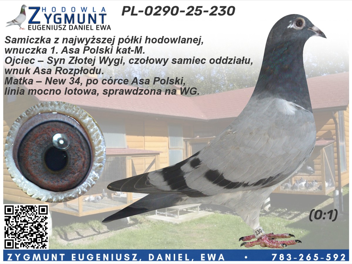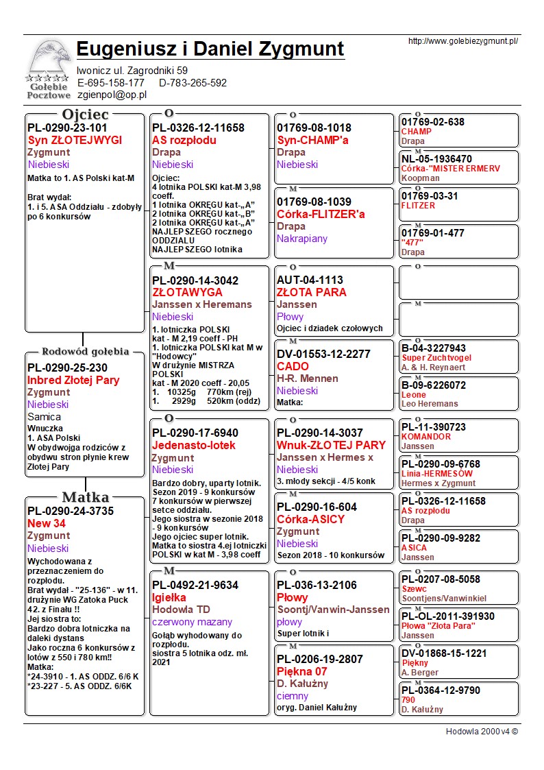 ***Transport: do 2 sztuk – 100 zł, 3–4 sztuki – 150 zł, powyżej 5 sztuk – 200 zł---Sezon 2025 przyniósł kolejne świetne wyniki – zdobyliśmy 4. i 5. miejsce w oddziale oraz tytuł II vice-mistrza oddziału w kategoriach MP oraz kat-A. Na wspólnych gołębnikach nasze ptaki pokazały klasę: 3. miejsce w finale WG Zatoka Puck, 7. AS WG Zatoka Puck, 36. AS OLR SuperCup, 33. i 86. AS OLR Mazury oraz 11. miejsce drużynowo na WG Zatoka Puck. Poprzedni sezon 2024 był jednym z najlepszych w naszej historii – 1., 3. i 4. miejsce w oddziale to wynik, jakiego jeszcze nie było. Do tego 1. i 2. miejsce w kat. MP oraz 1. w kat. A. Sezon zakończyliśmy z 9 gołębiami z 6 konkursami (w tym 5 pierwszych w oddziale) i aż 86 gołębiami z ponad 4 konkursami. Na wspólnych gołębnikach również liczne sukcesy: 2. z finału OLR Mazury, 16. z Ekstra Finału WG Zatoka Puck, 12. z MWG Rogowo, 2. z WG Zatoka Puck, 70. z finału MWG Rogowo, 43. AS Rogowo, 55. z finału OLR SuperCup, 36. AS WG Podhale, a gołąb po naszym samcu zdobył 2. miejsce w finale OLR SuperCup. Więcej informacji w rodowodach lub pod numerem telefonu 783 265 592.