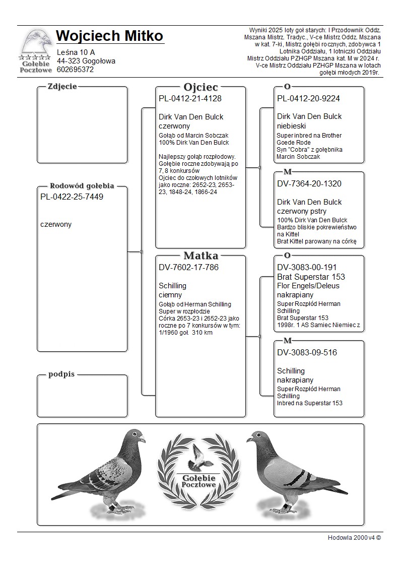 Oryginalny gołąb z hodowli Wojciech Mitko. Gołąb wychowany po gołębiach rozpłodowych - PRAWDOPODOBNIE to SAMIEC. Szczegóły pochodzenia w rodowodzie. Więcej informacji pod nr tel.: 602695372. Możliwy odbiór osobisty lub wysyłka 150 zł do 6 szt. Przy wylicytowaniu 5 szt. kolejną najtańszą sztukę dokładam gratis.