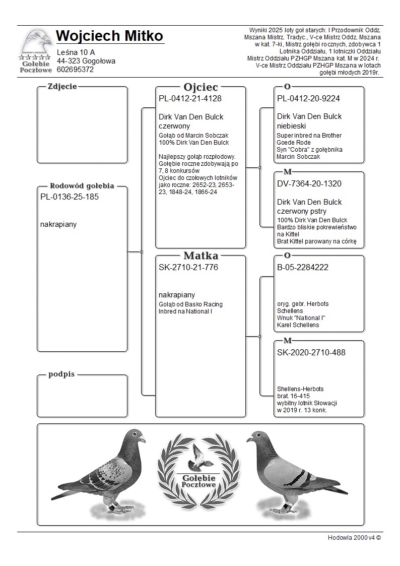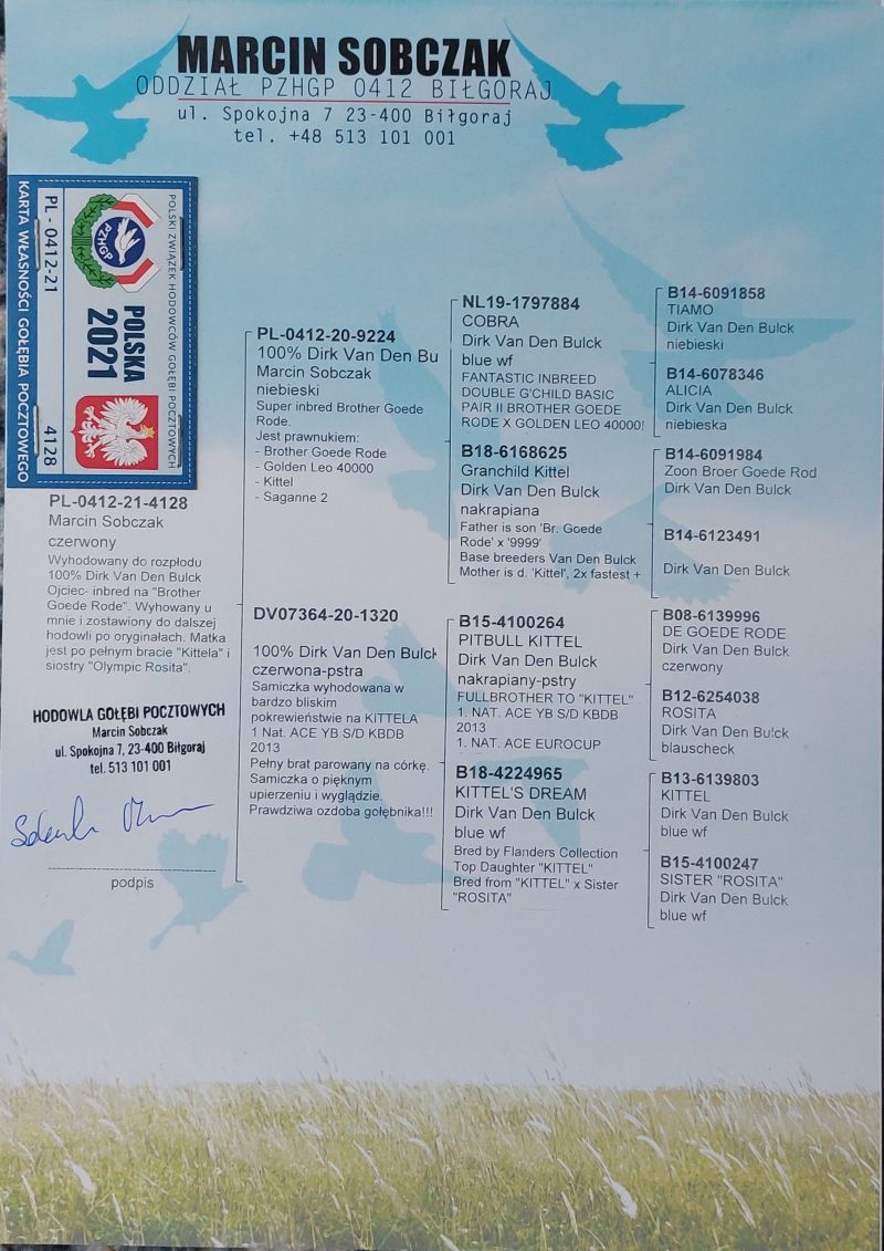 Oryginalny gołąb z hodowli Wojciech Mitko. Gołąb wychowany po gołębiach rozpłodowych - PRAWDOPODOBNIE to SAMIEC. Szczegóły pochodzenia w rodowodzie. Więcej informacji pod nr tel.: 602695372. Możliwy odbiór osobisty lub wysyłka 150 zł do 6 szt. Przy wylicytowaniu 5 szt. kolejną najtańszą sztukę dokładam gratis.