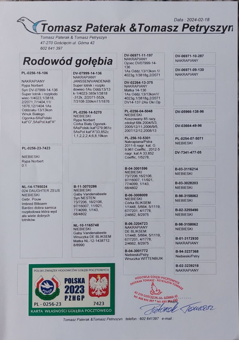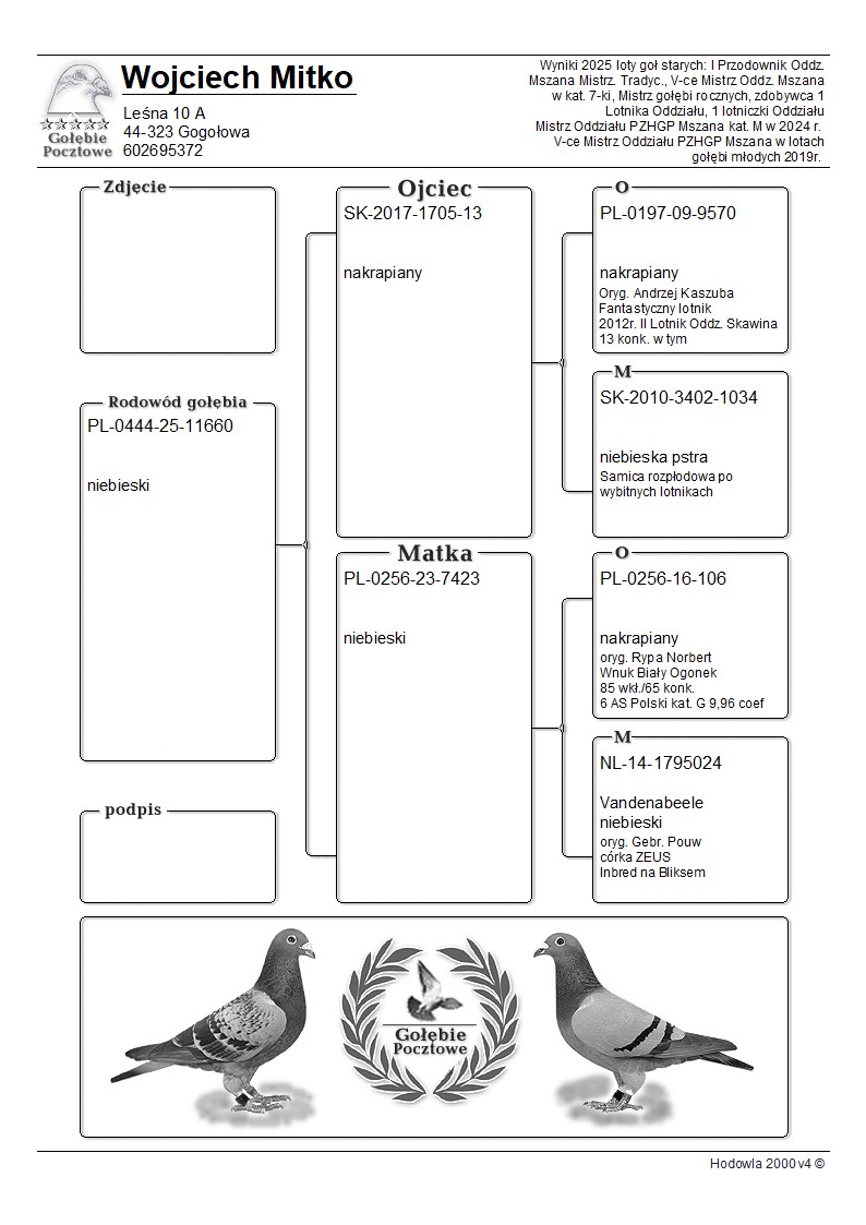 Oryginalny gołąb z hodowli Wojciech Mitko. Gołąb wychowany po gołębiach rozpłodowych - PRAWDOPODOBNIE to SAMICA. Szczegóły pochodzenia w rodowodzie. Więcej informacji pod nr tel.: 602695372. Możliwy odbiór osobisty lub wysyłka 150 zł do 6 szt. Przy wylicytowaniu 5 szt. kolejną najtańszą sztukę dokładam gratis.