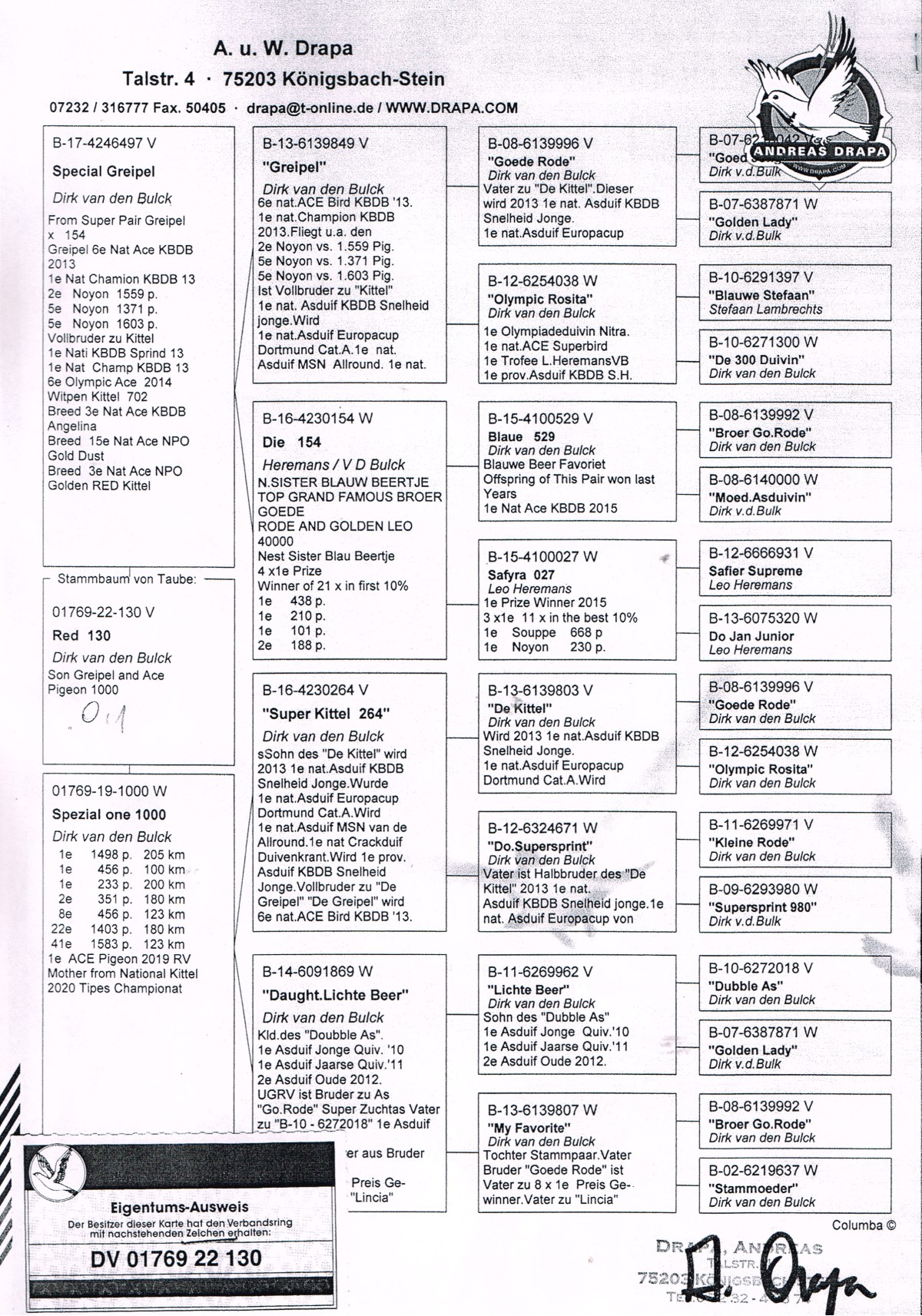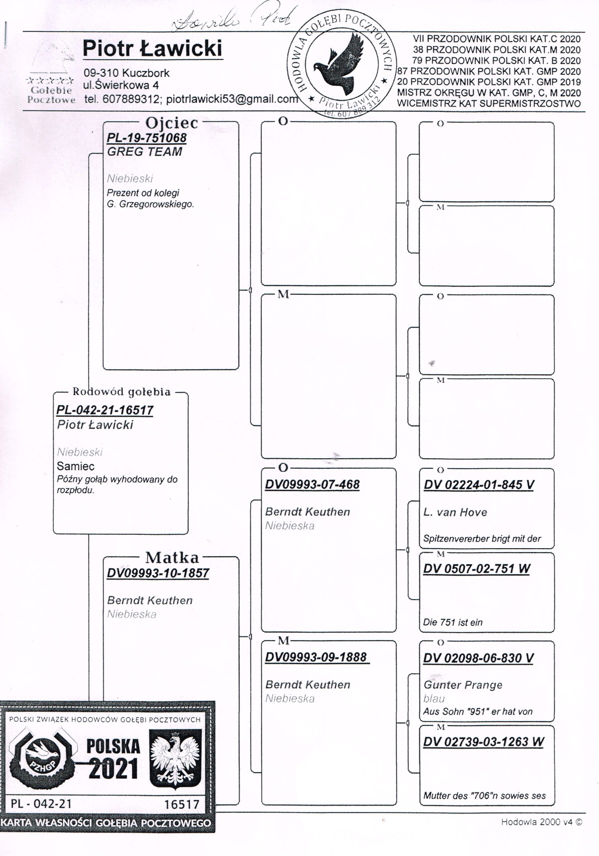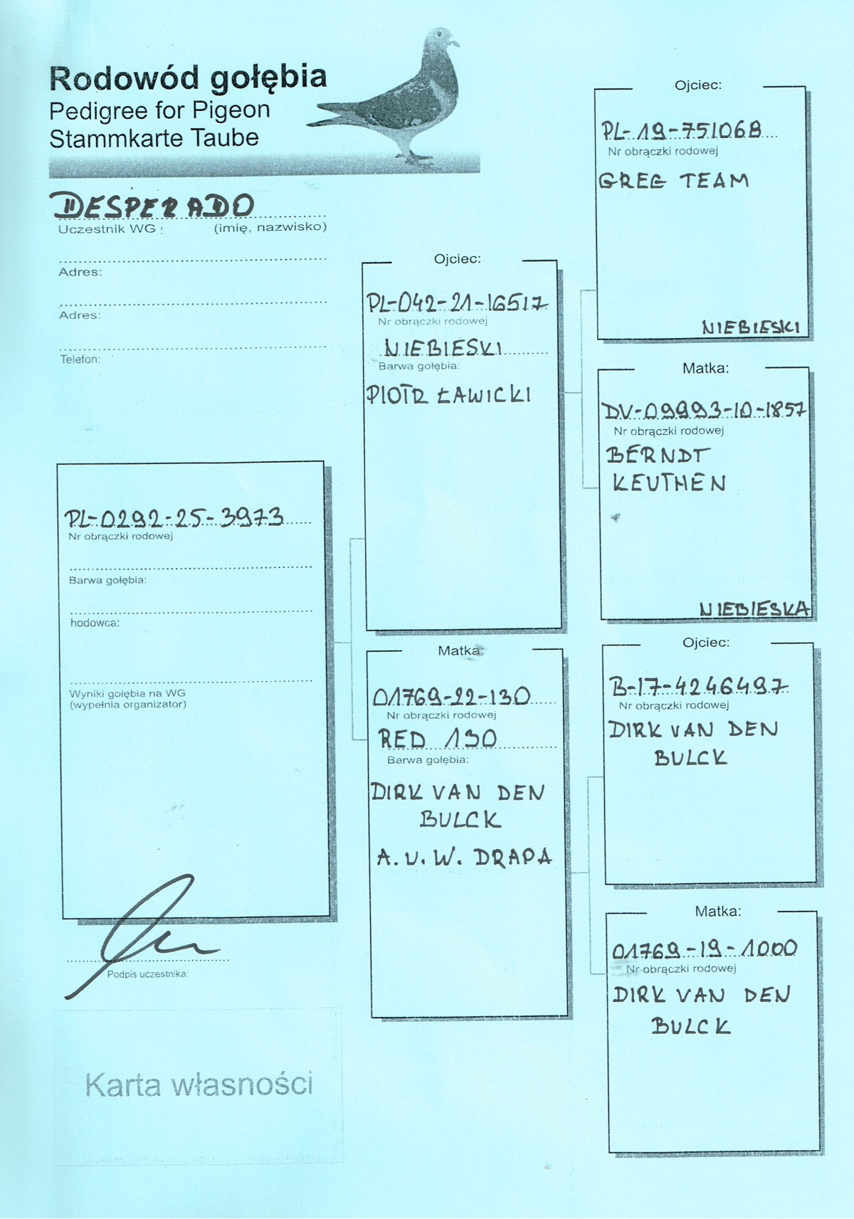 | Lot | Data | Dystans [km] | Ilość gołębi | Pozycja | Prędkość [m/min] |