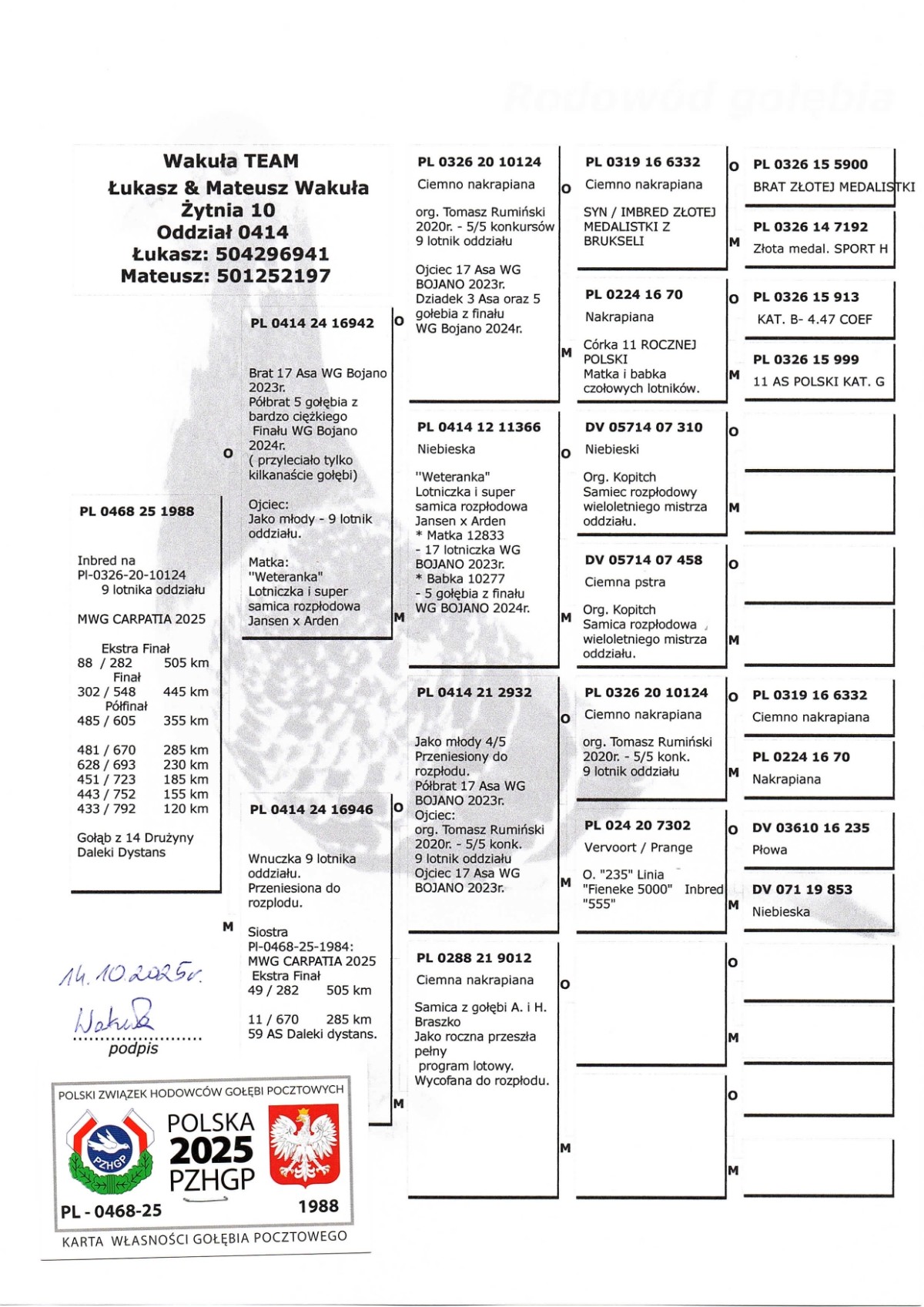 | Lot | Data | Dystans [km] | Ilość gołębi | Pozycja | Prędkość [m/min] |