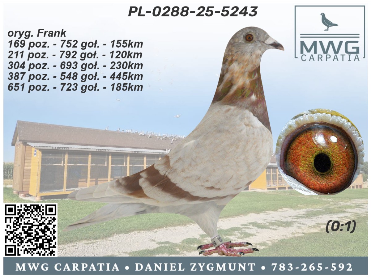Opis: Gołąbek z MWG Carpatia, po całym sezonie lotowym 2025. Drużyna: Frank, 169 z 155 km i 211 z 120 km. Zorganizowaliśmy 9 lotów treningowych do 92km oraz 7 lotów konkursowych od 120 do 445km, a także ekstra finał z odległości 505km. Ptaki łącznie zrobiły 2153km, a niektóre nawet 2658km. Cały sezon był ciężki i wymagający, więc wszystkie ptaki, które sobie poradziły są warte i cenne uwagi. Więcej informacji pod numerem 783-265-592. Transport 100 zł do 2szt. Do 3-4szt - 150zł. Powyżej 5szt - 200zł. Gołąbki zostaną dostarczone do 14 dni po zakończeniu aukcji. Zapraszamy do udziału w edycji 2026 :)