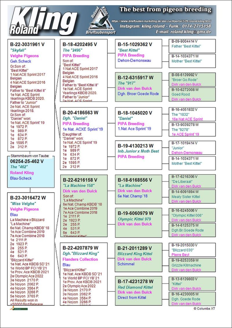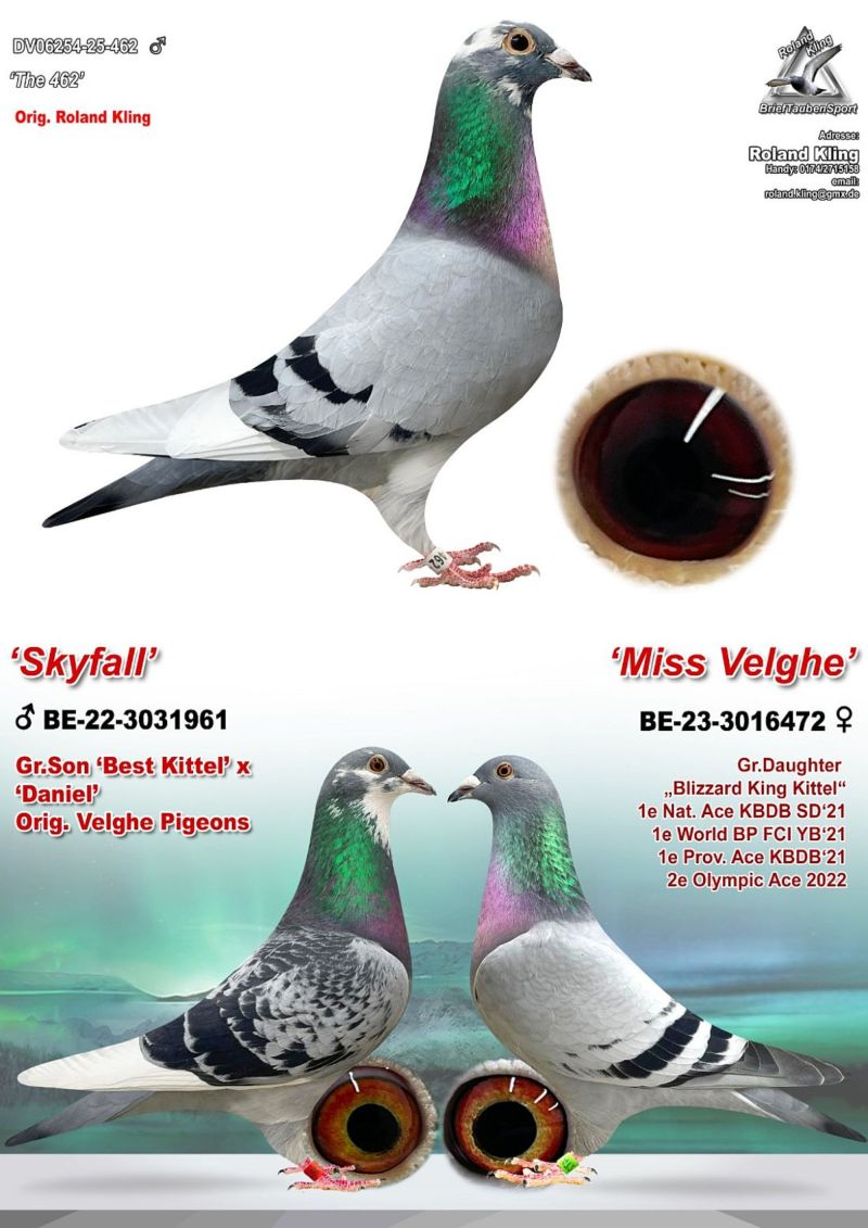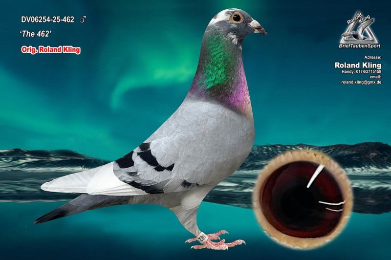 Oryginalny gołąb z hodowli Rolanda Klinga. Szczegóły pochodzenia w rodowodzie. Gołębie są już przywiezione do Polski i przed zakończeniem aukcji można je obejrzeć u kolegi Roberta Grochowskiego w Urbanowicach. Oferowany gołąb to prawdopodobnie SAMIEC. Więcej informacji pod numerem telefonu 600133330