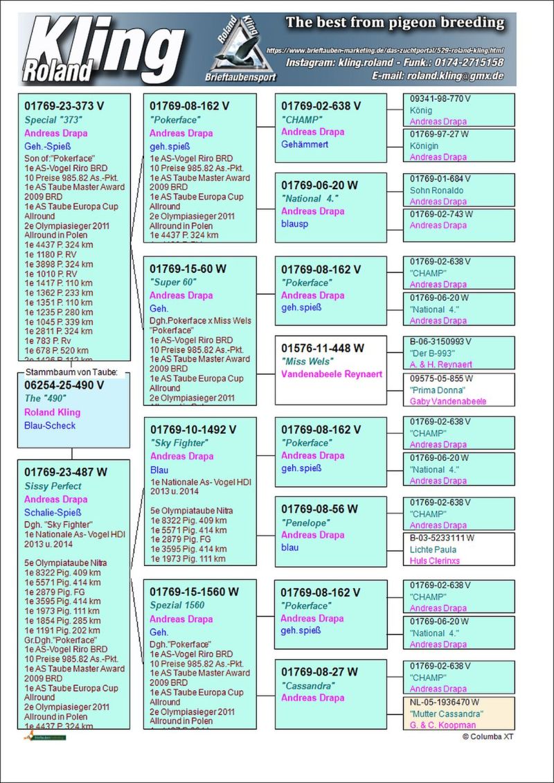 Oryginalny gołąb z hodowli Rolanda Klinga. Szczegóły pochodzenia w rodowodzie. Gołębie są już przywiezione do Polski i przed zakończeniem aukcji można je obejrzeć u kolegi Roberta Grochowskiego w Urbanowicach. Oferowany gołąb to prawdopodobnie SAMIEC. Więcej informacji pod numerem telefonu 600133330