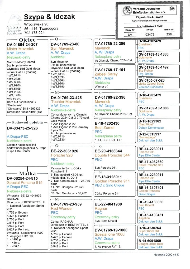 Profesjonalna hodowla z wieloletnim doświadczeniem, posiadająca w swoim stadzie materiał najwyższej światowej klasy. Więcej informacji w załączonych materiałach oraz pod nr tel. 792-175-024 Oferowany gołąb to prawdopodobnie SAMICA. Płeć pisana orientacyjnie Wysyłka 100 zł