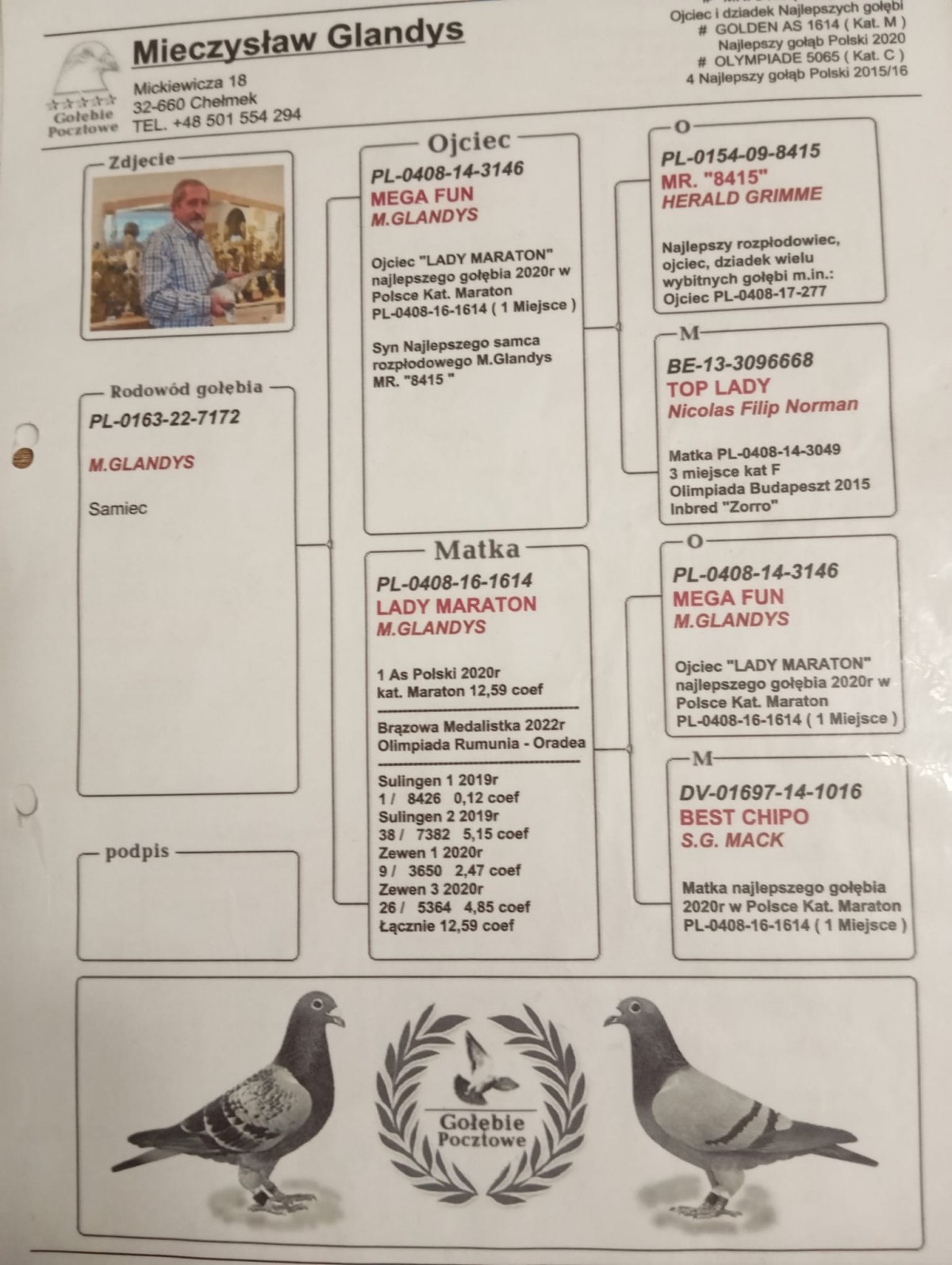 | Lot | Data | Dystans [km] | Ilość gołębi | Pozycja | Prędkość [m/min] |