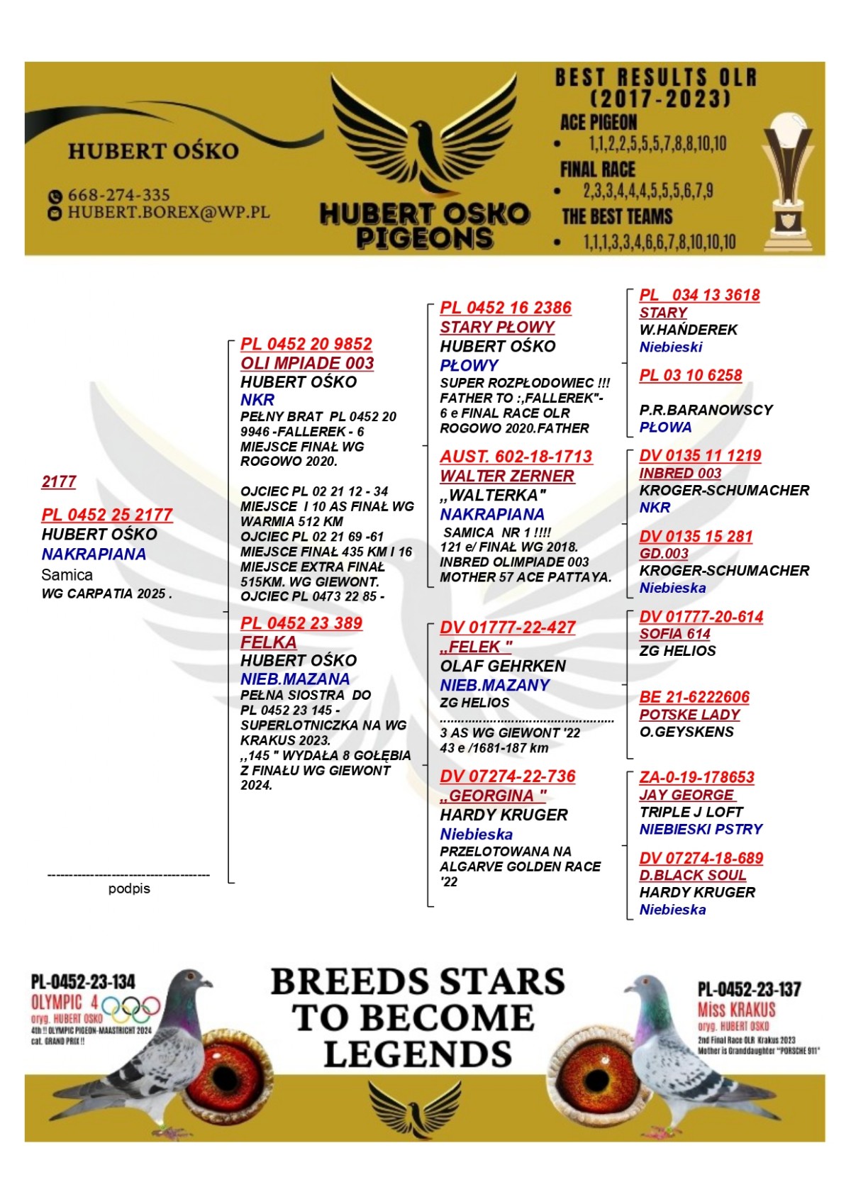 | Lot | Data | Dystans [km] | Ilość gołębi | Pozycja | Prędkość [m/min] |