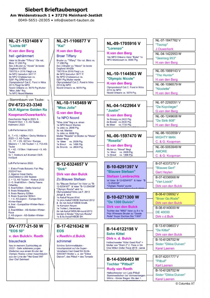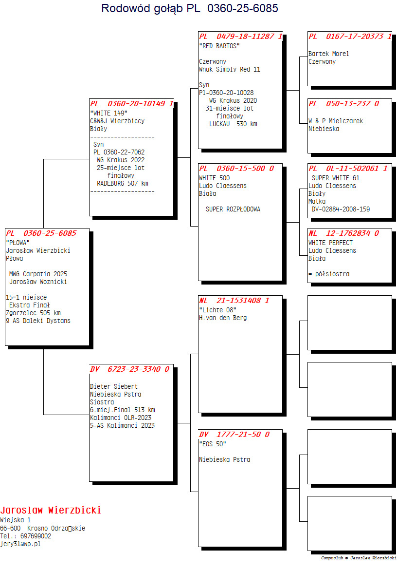 | Lot | Data | Dystans [km] | Ilość gołębi | Pozycja | Prędkość [m/min] |