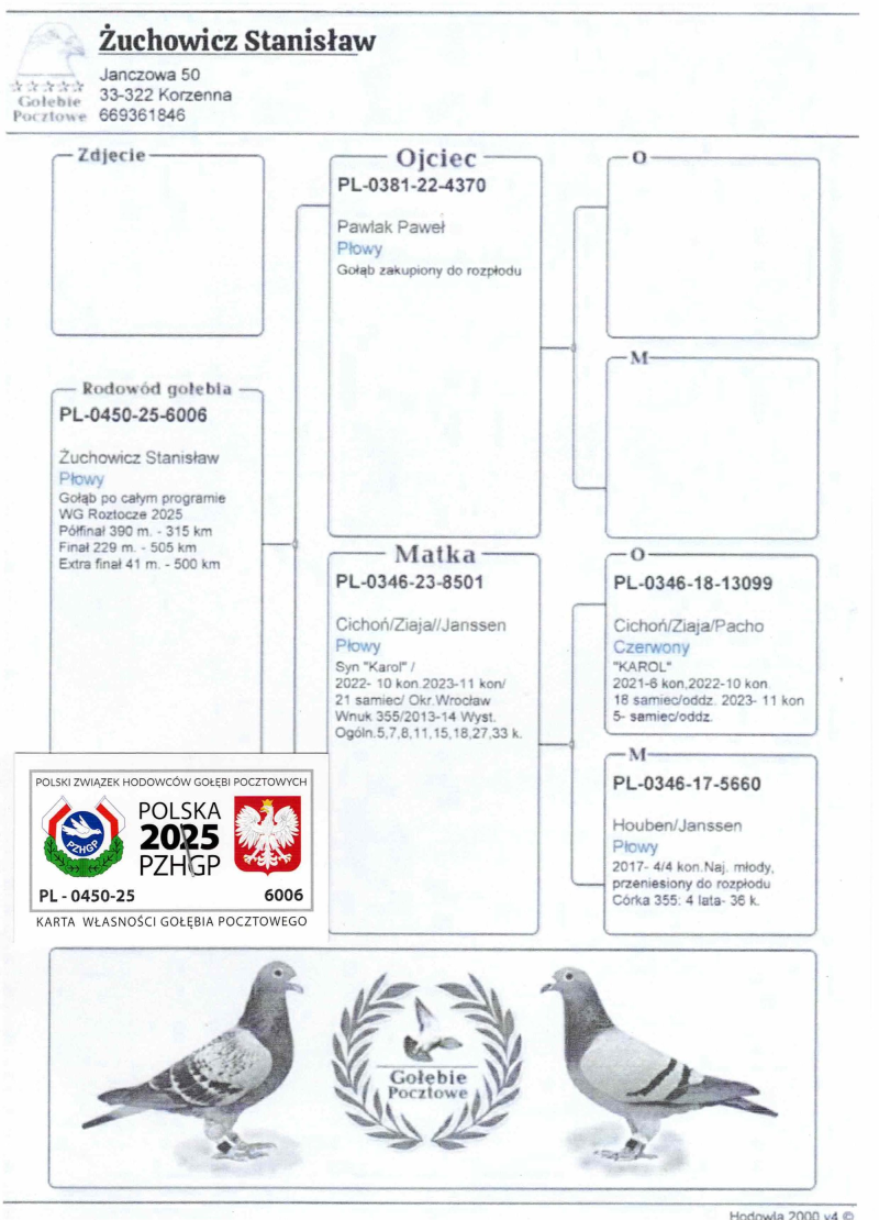 PL-0430-25-5891 WG ROZTOCZE FINAŁ 227poz.505km Extra Finał 32poz.500km 34 Drużyna 2x500km