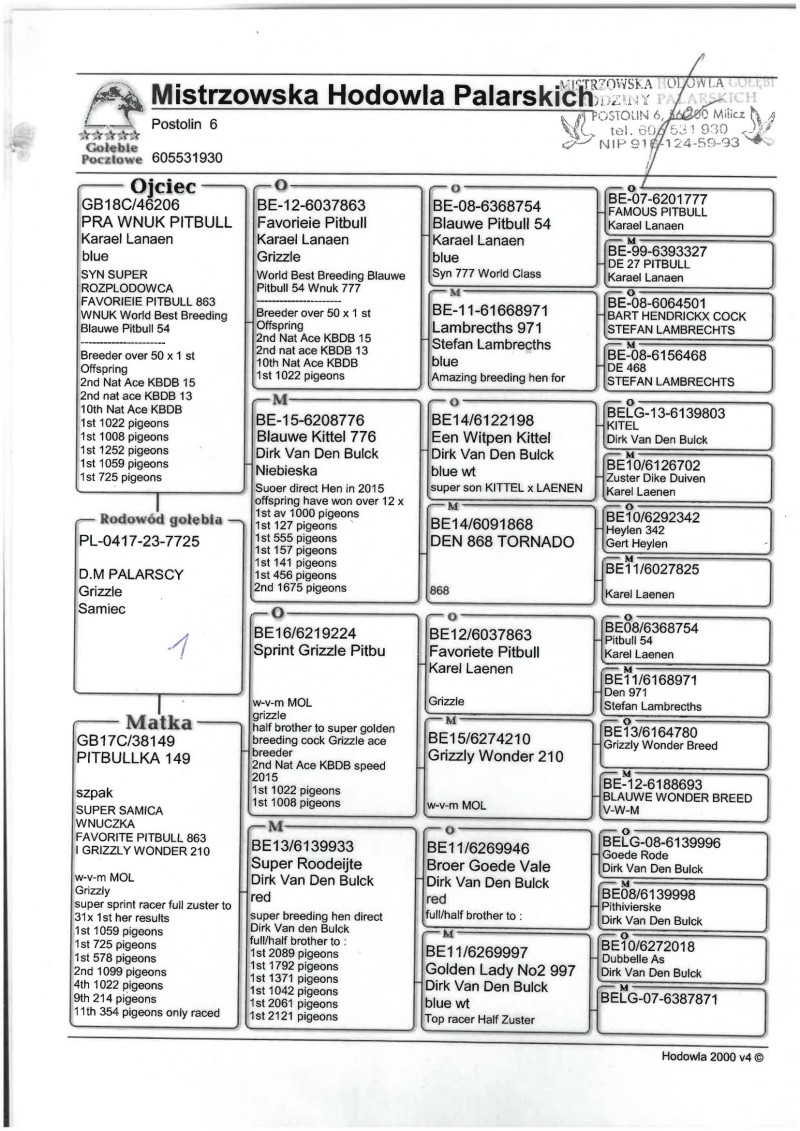 Oryginalny gołąb z hodowli Mistrzowska Hodowla Palarskich. Szczegóły pochodzenia w rodowodzie. Więcej informacji pod nr. tel.: 785 443 802
