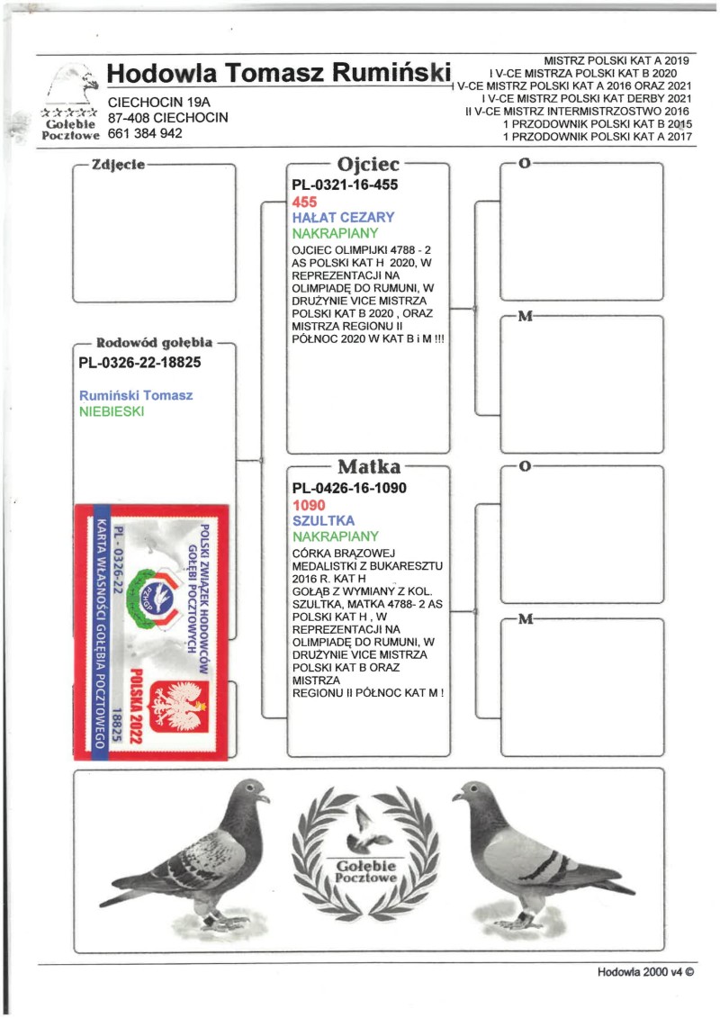 Oryginalny gołąb z hodowli Tomasza Rumińskiego. Szczegóły pochodzenia w rodowodzie. Więcej informacji pod nr. tel.: 785 443 802