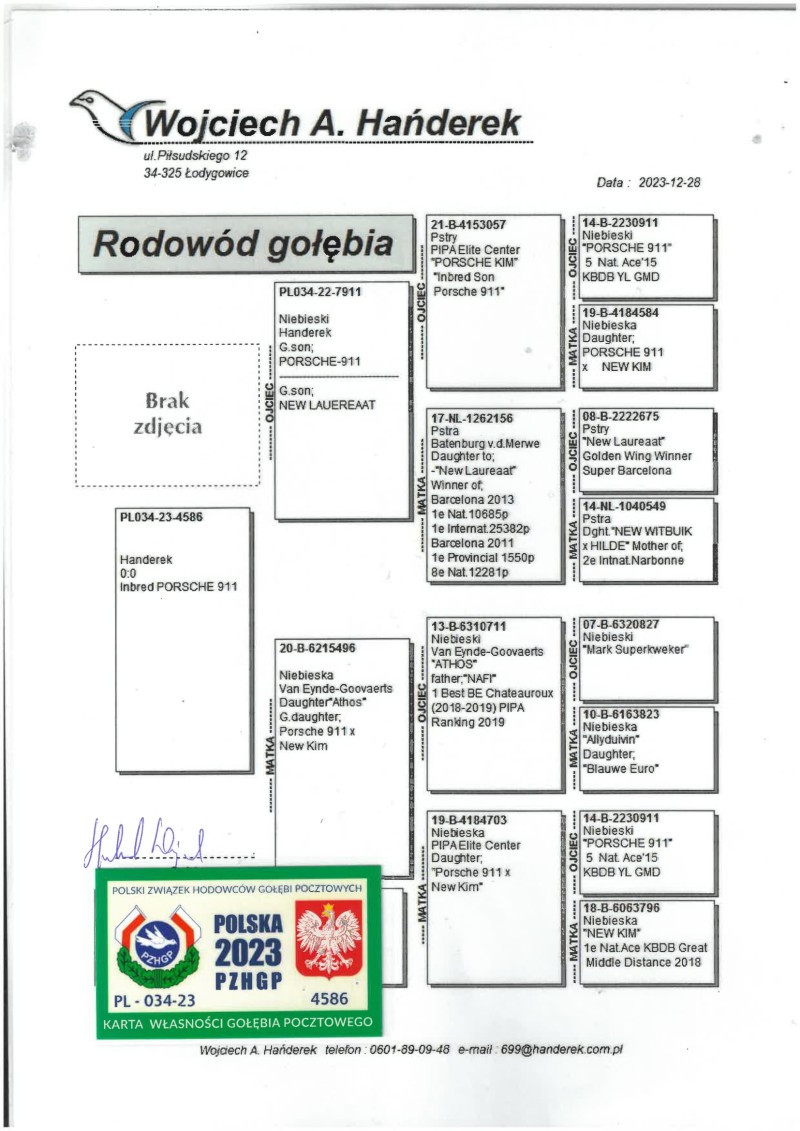Oryginalny gołąb z hodowli Wojciech A. Hańderek. Szczegóły pochodzenia w rodowodzie. Więcej informacji pod nr. tel.: 785 443 802
