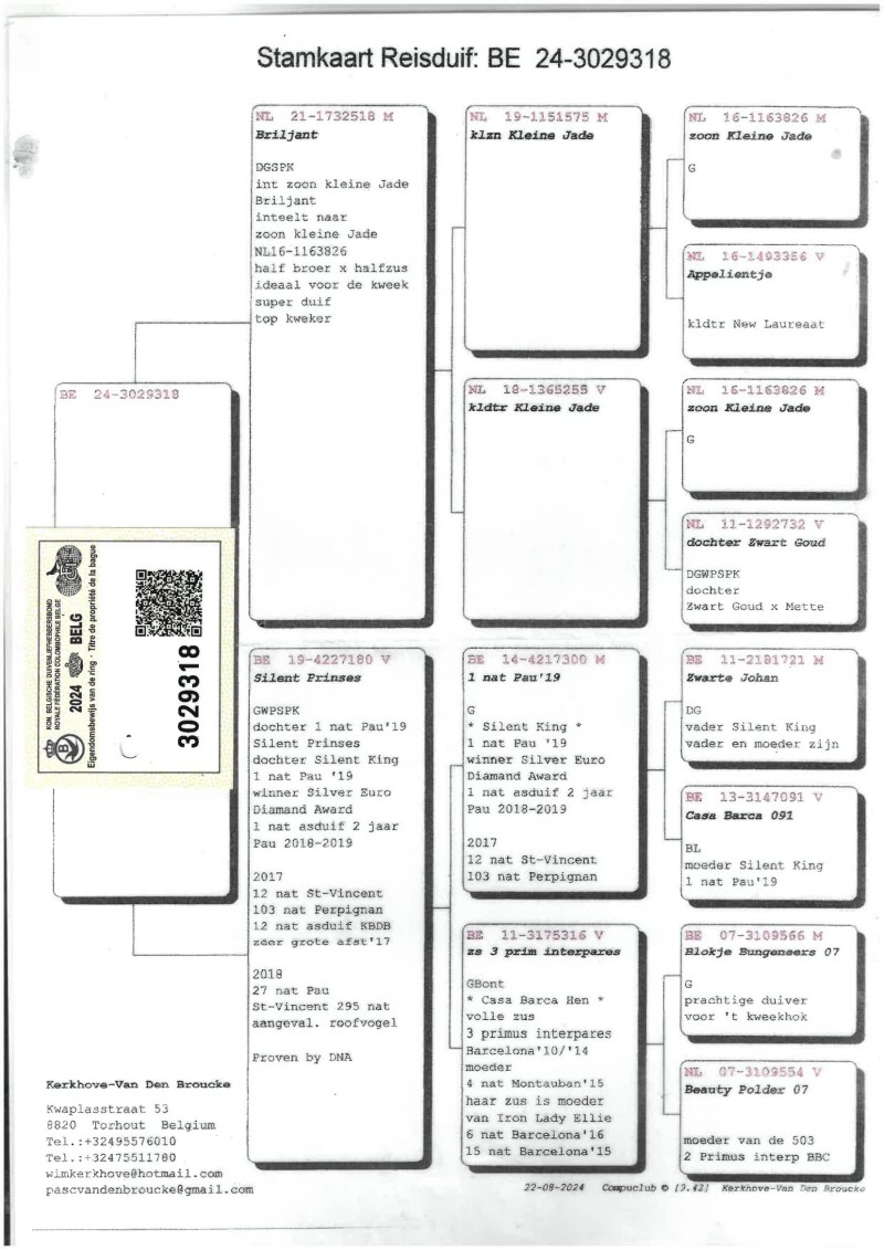 Oryginalny gołąb z hodowli Kerkhove-van den Broucke. Szczegóły pochodzenia w rodowodzie. Więcej informacji pod nr. tel.: 785 443 802