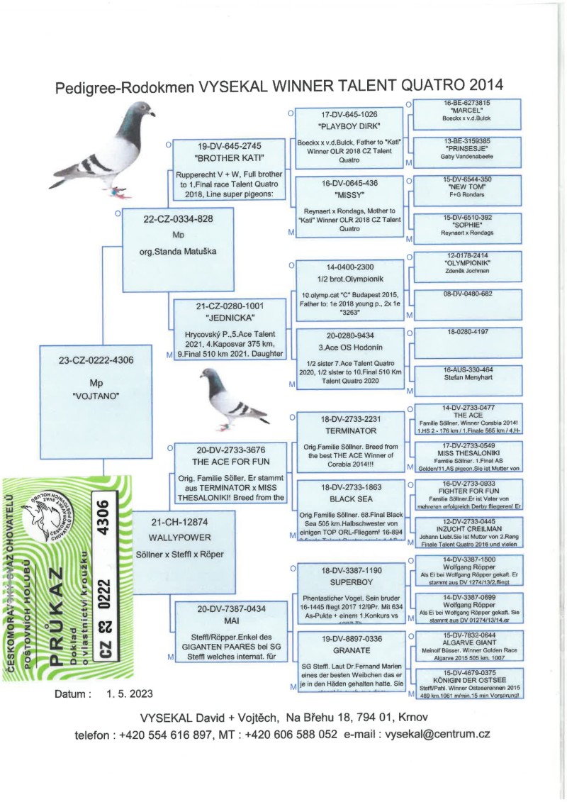 Oryginalny gołąb z hodowli David + Vojtech Vysekal. Szczegóły pochodzenia w rodowodzie. Więcej informacji pod nr. tel.: 785 443 802